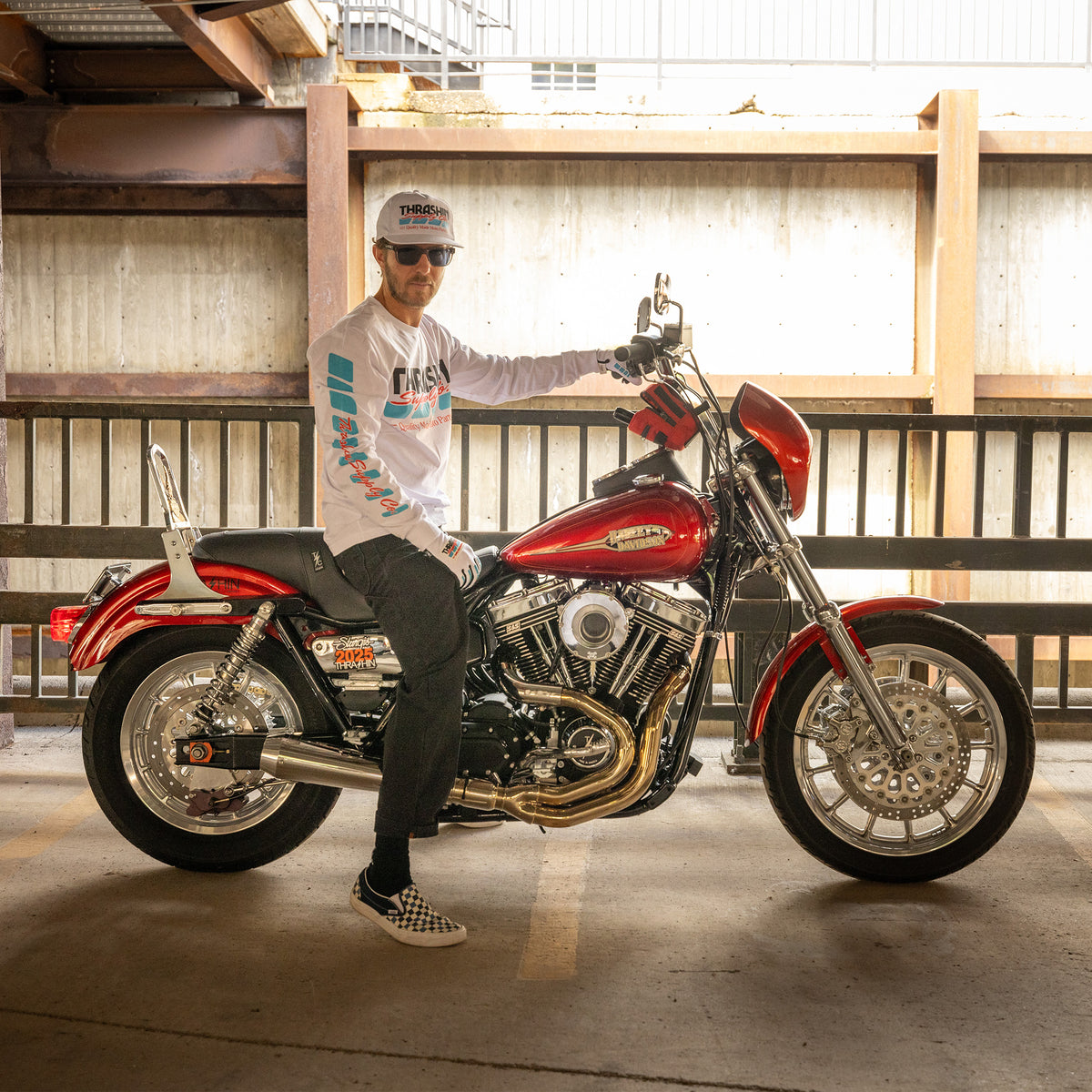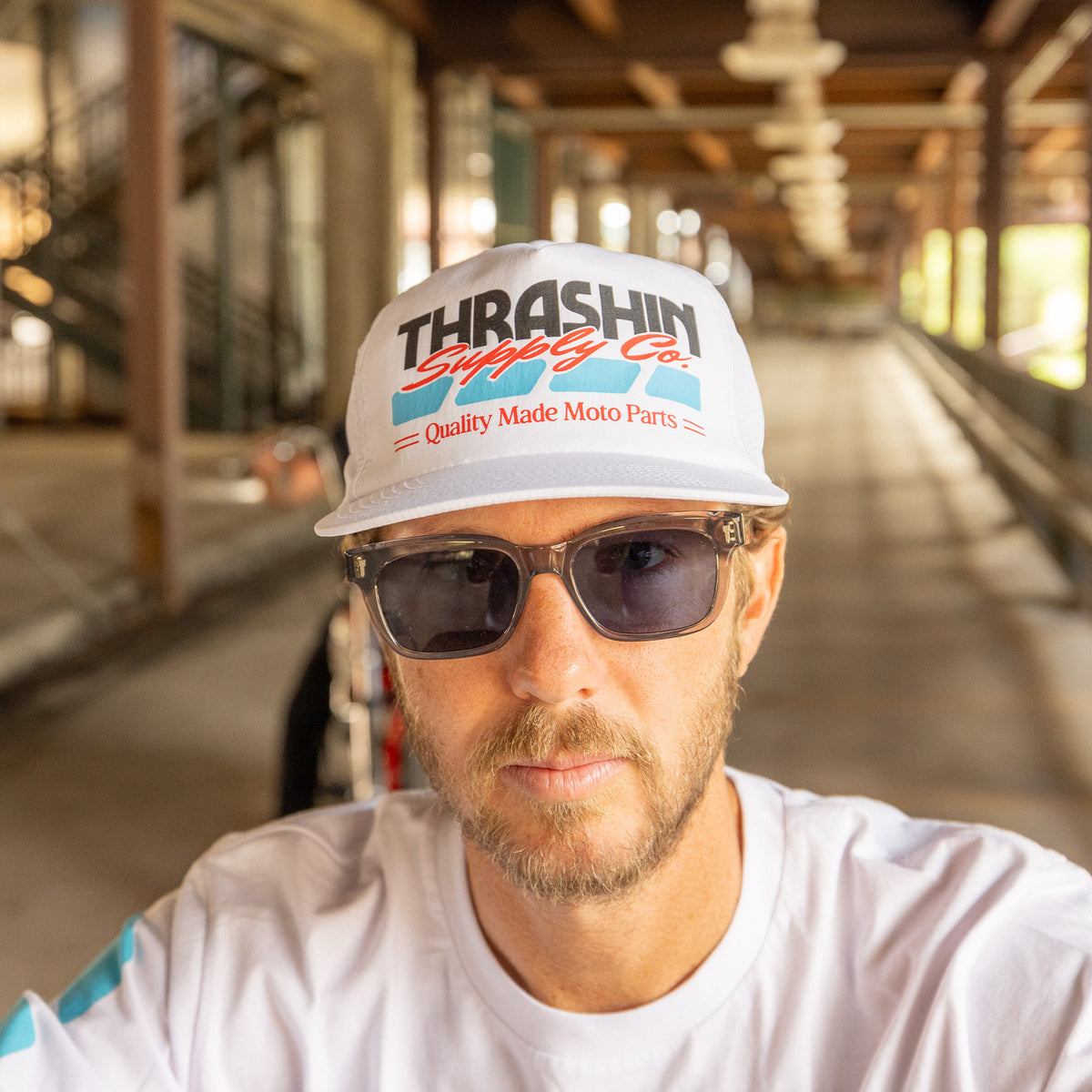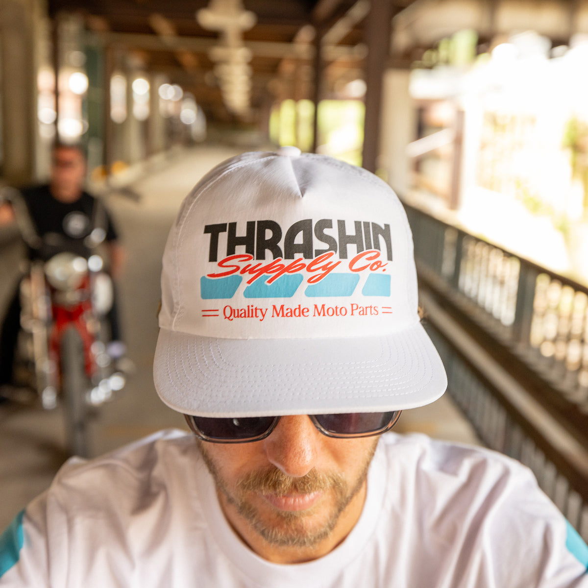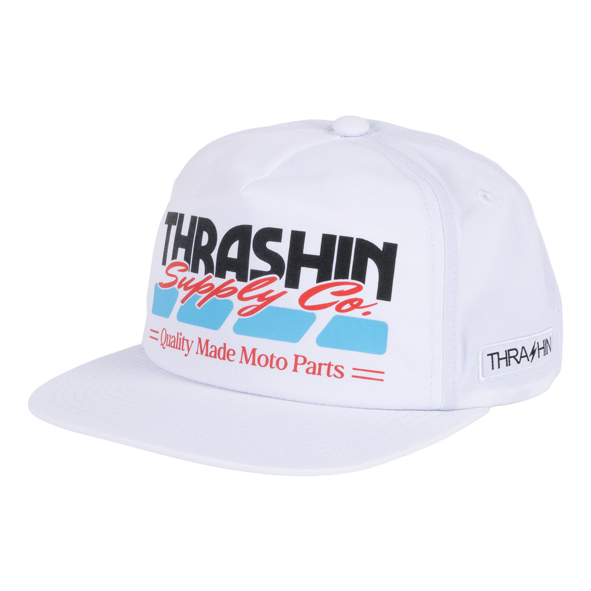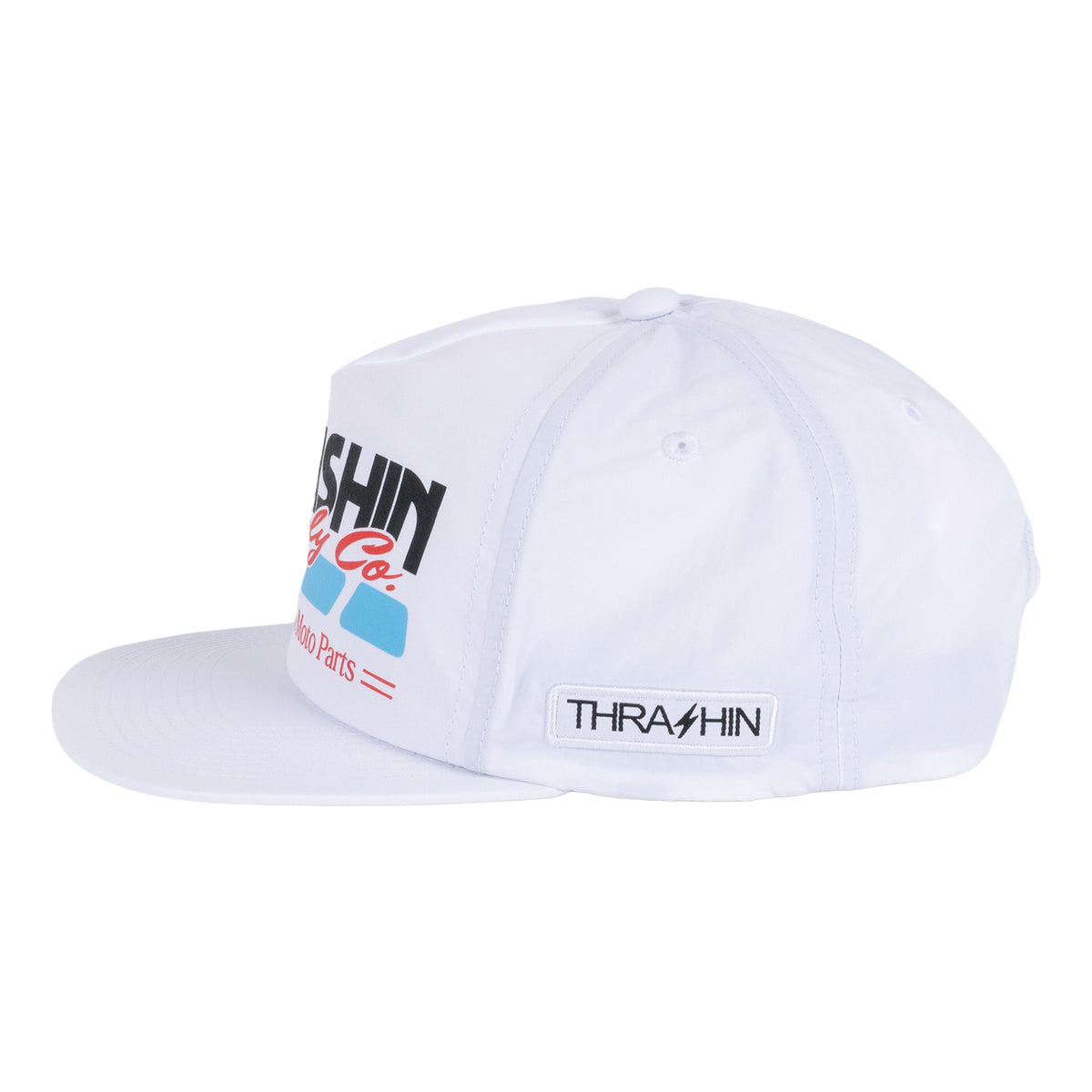 THRASHIN® Moto Snapback is a retro inspired 5-panel, built from mid-weight nylon with a soft structured fit. Featuring a bold screen-printed front design and custom labeling inside and out, this cap blends timeless style with THRASHIN® durability—built to last both on and off the bike.