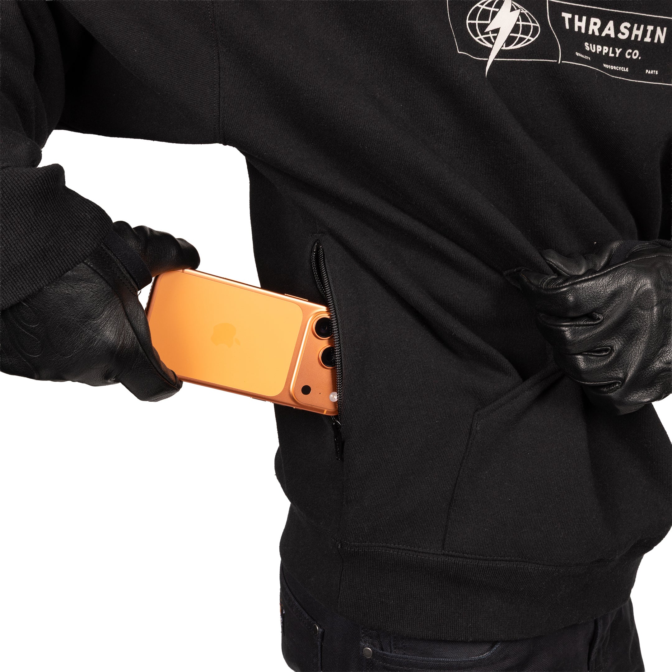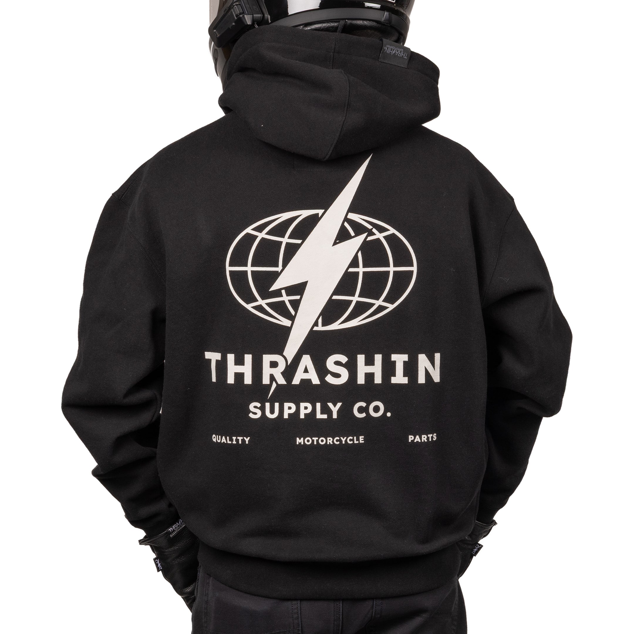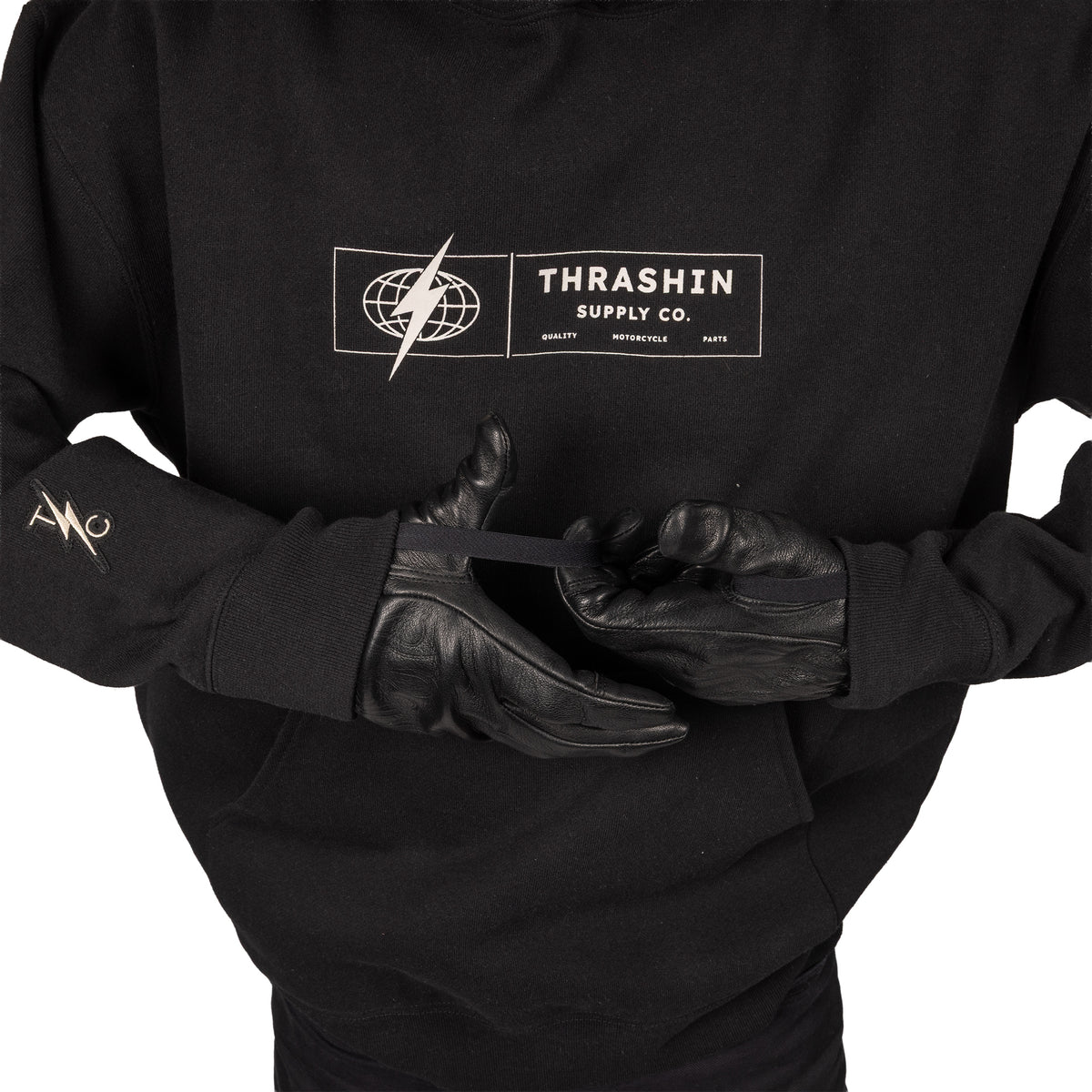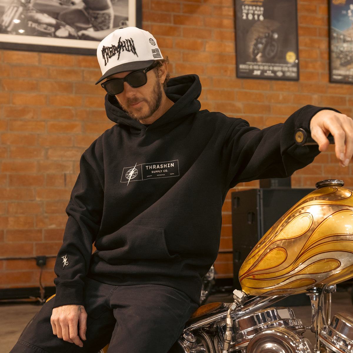 THRASHIN® Hoodies are built for the ride, featuring elastic thumb loops to keep sleeves in place at high speeds and a hidden right-hip zipper pocket big enough for your phone or wallet. Made from heavyweight 12.5oz fleece, they offer an oversized fit with a drop shoulder and no drawcord for a relaxed, modern look.
