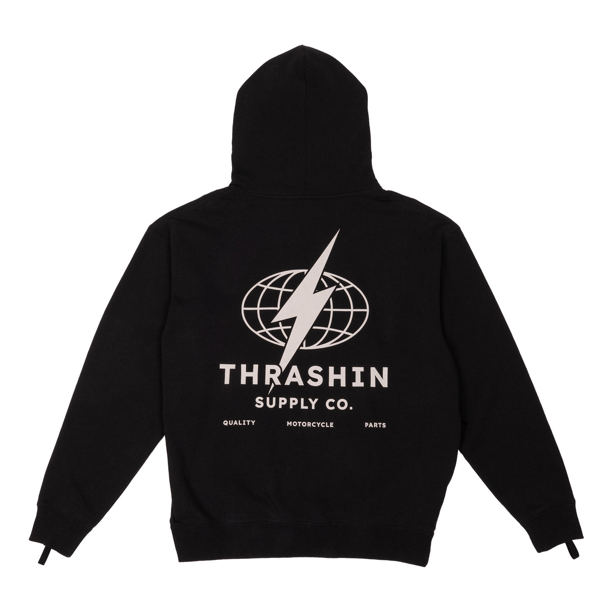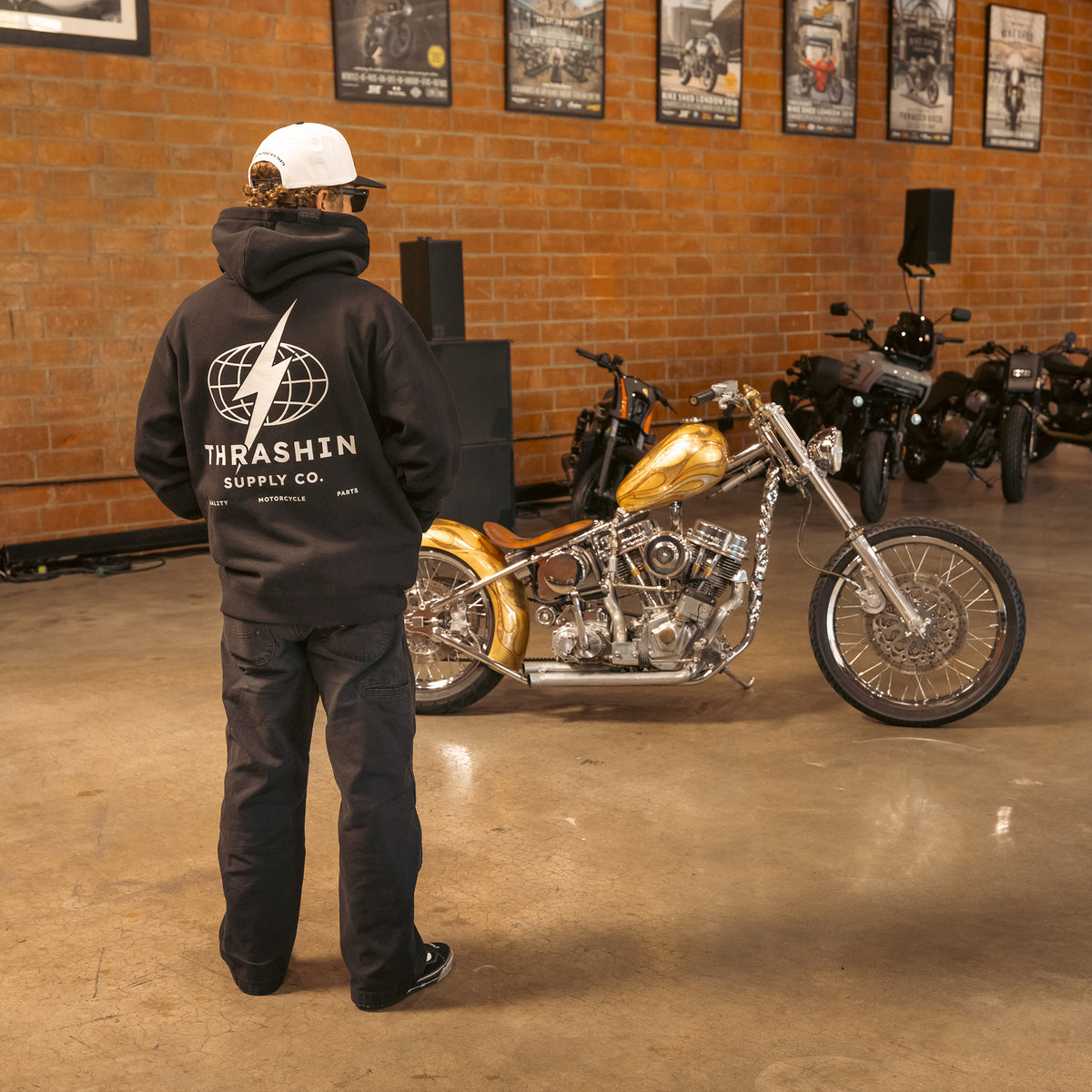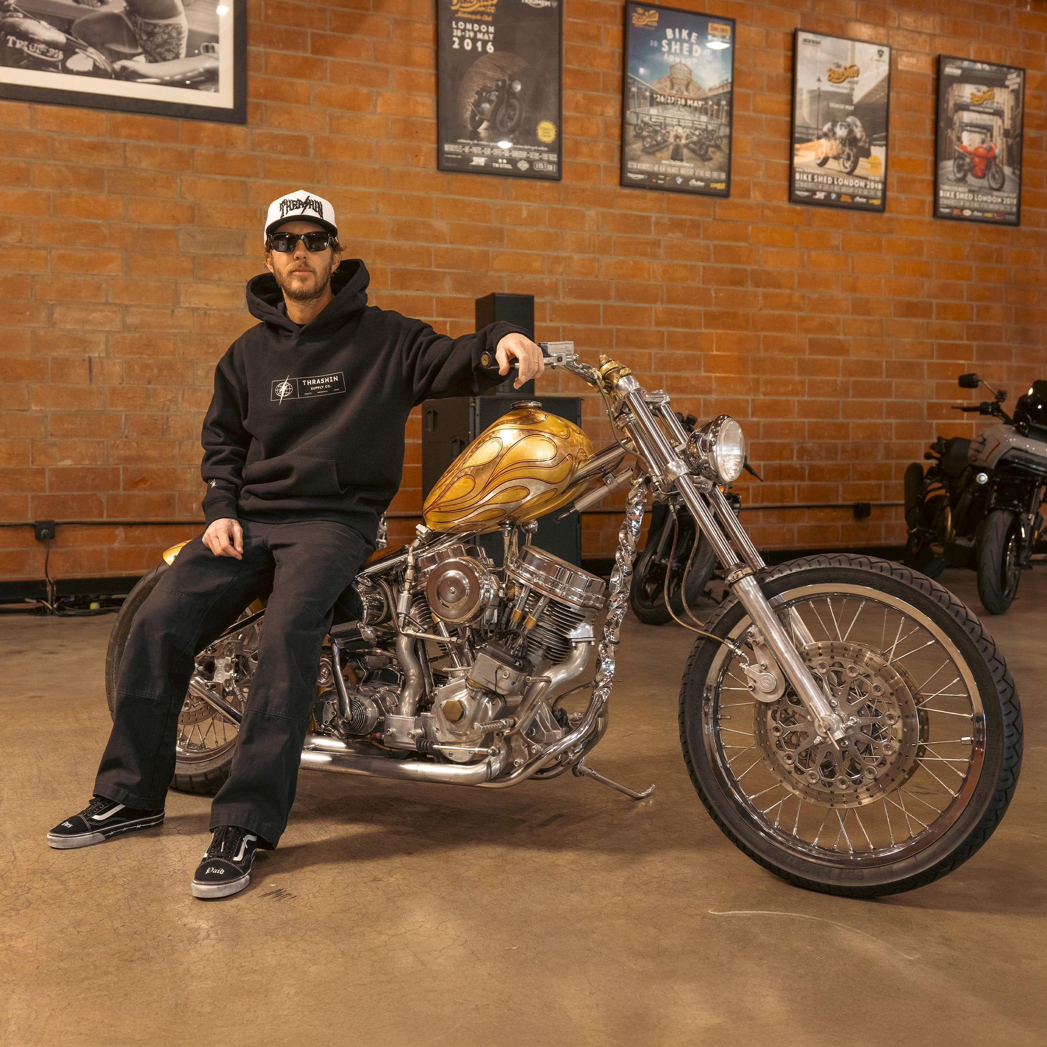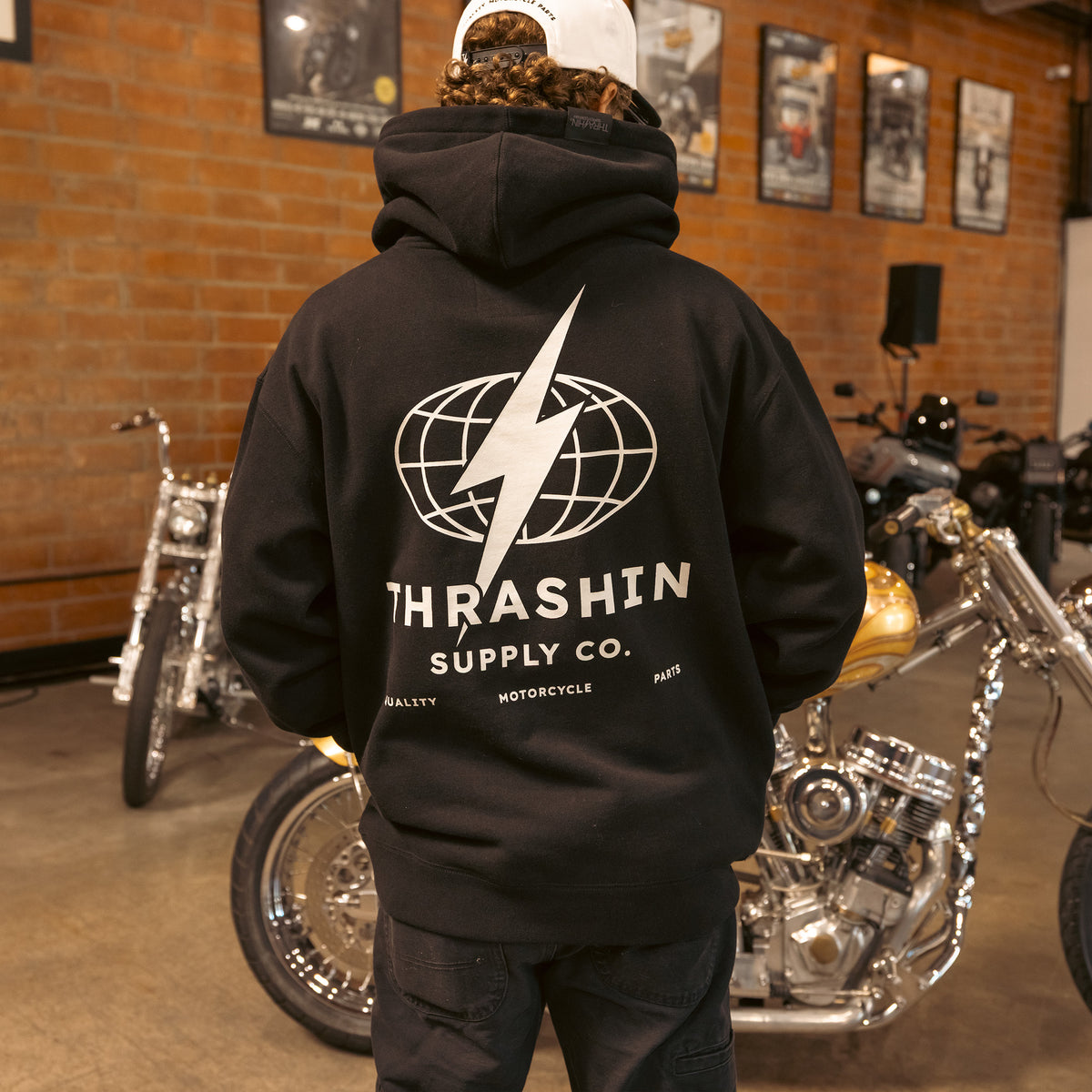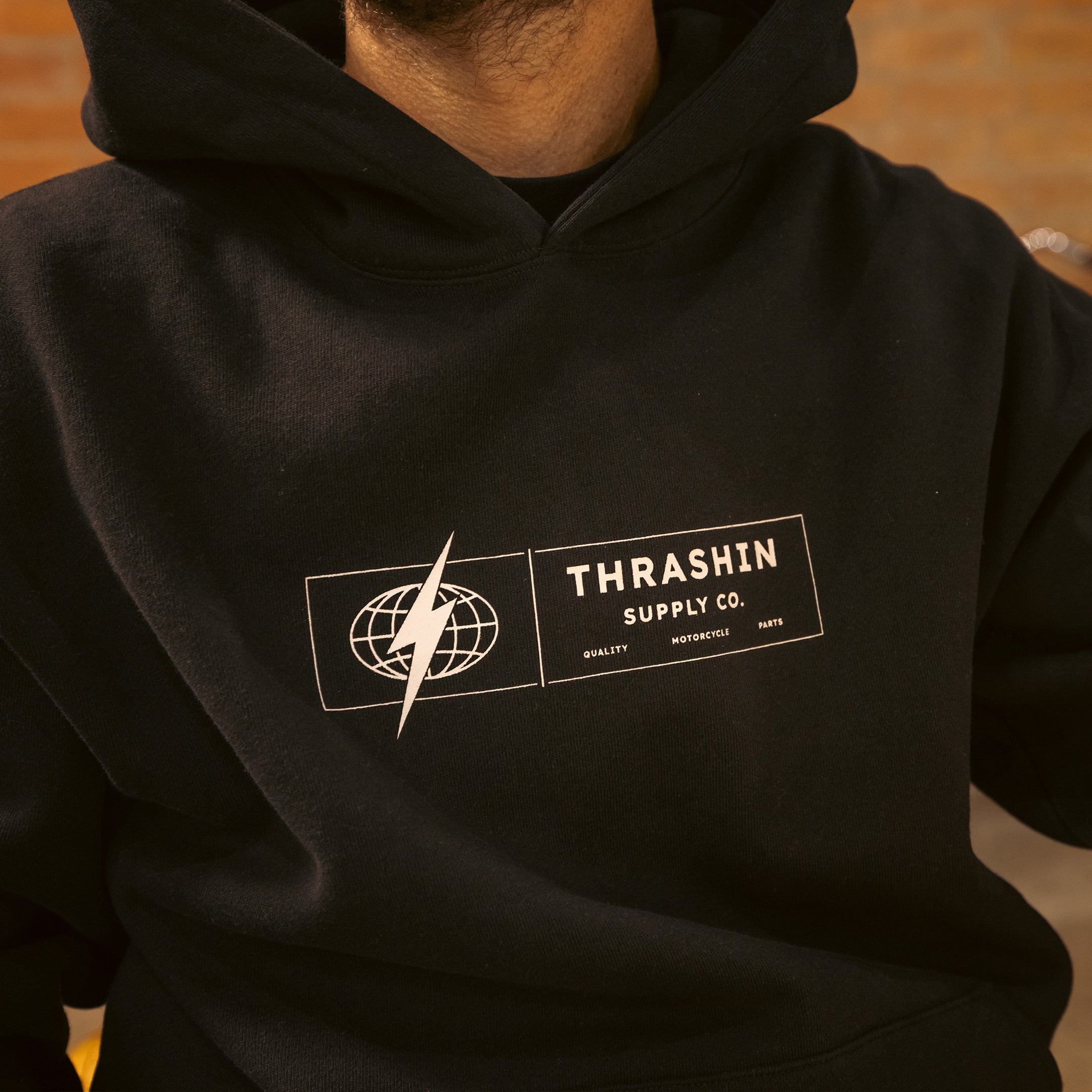 THRASHIN® Hoodies are built for the ride, featuring elastic thumb loops to keep sleeves in place at high speeds and a hidden right-hip zipper pocket big enough for your phone or wallet. Made from heavyweight 12.5oz fleece, they offer an oversized fit with a drop shoulder and no drawcord for a relaxed, modern look.