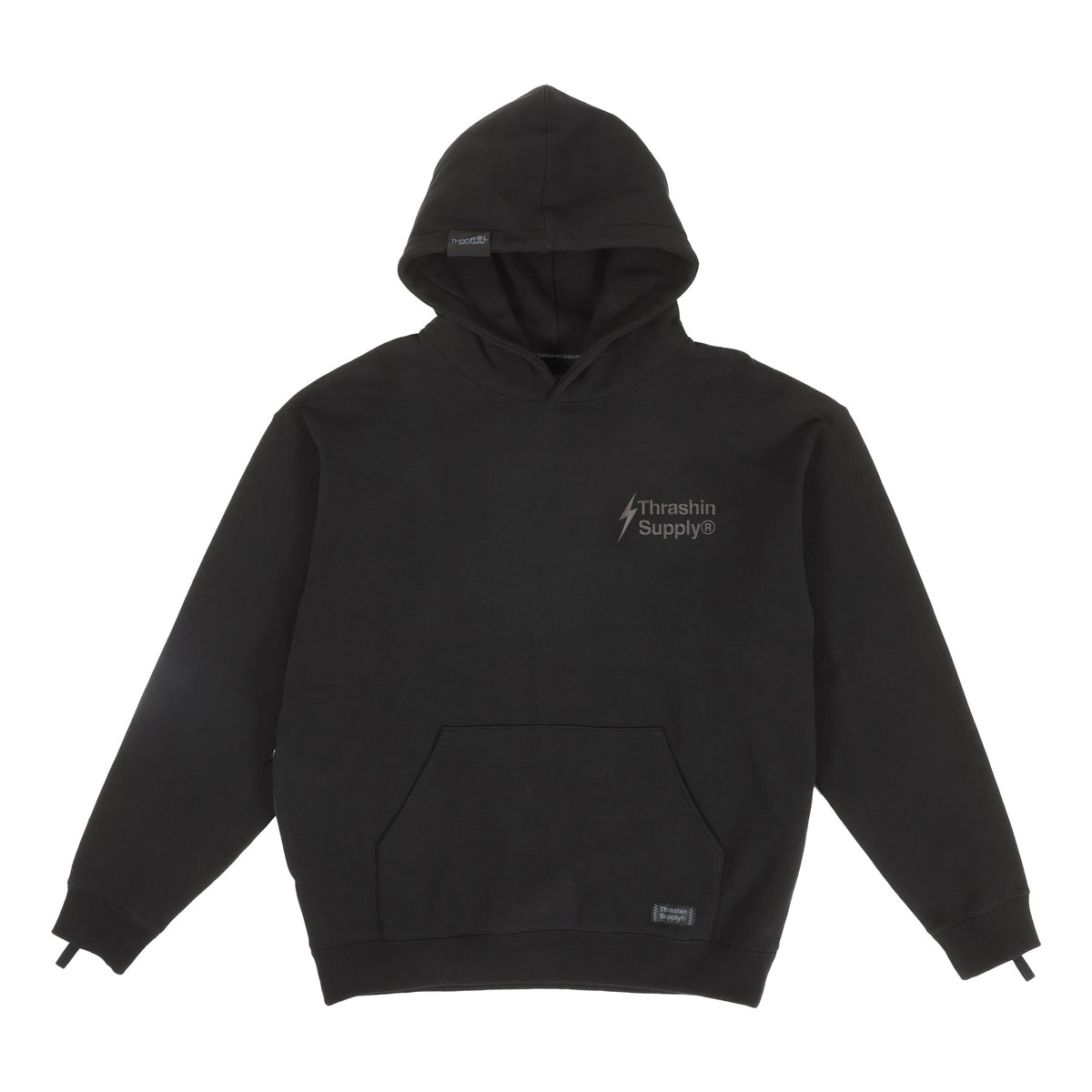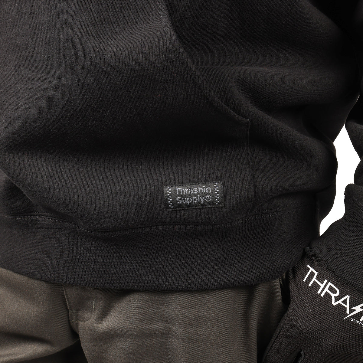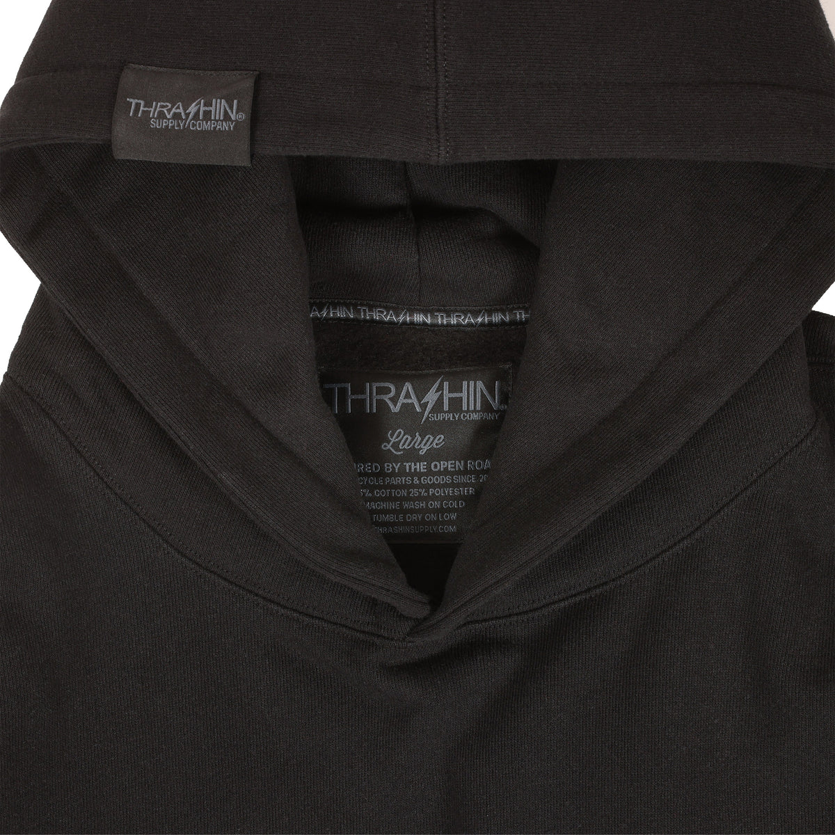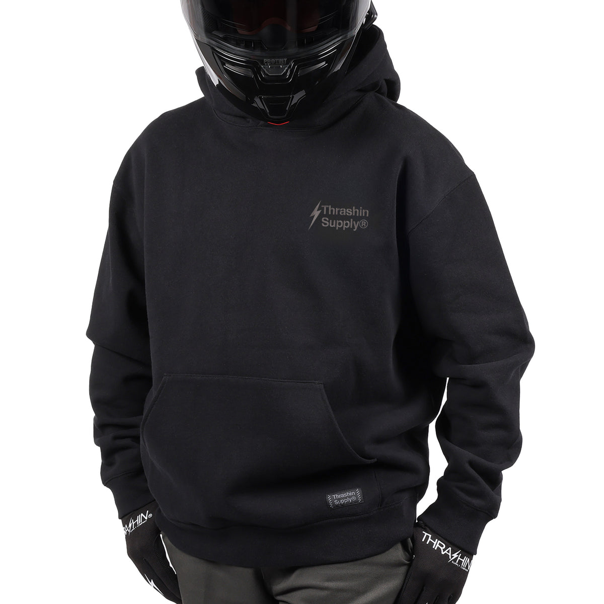 Designed with riding in mind, our hoodies feature elastic thumb loops that help keep your sleeves in place while riding at high speeds and a hidden zipper pocket on the right hip with enough room to hold your phone and/or wallet! This hoodie has an oversized fit, drop shoulder, and no drawcord for a relaxed feel and modern appearance.
