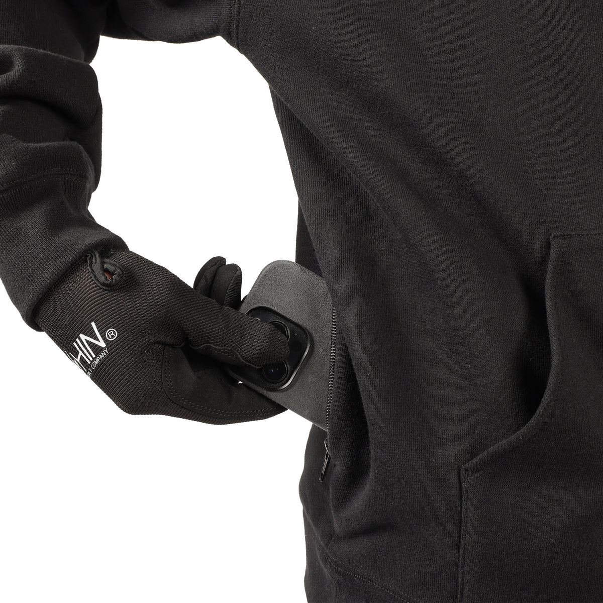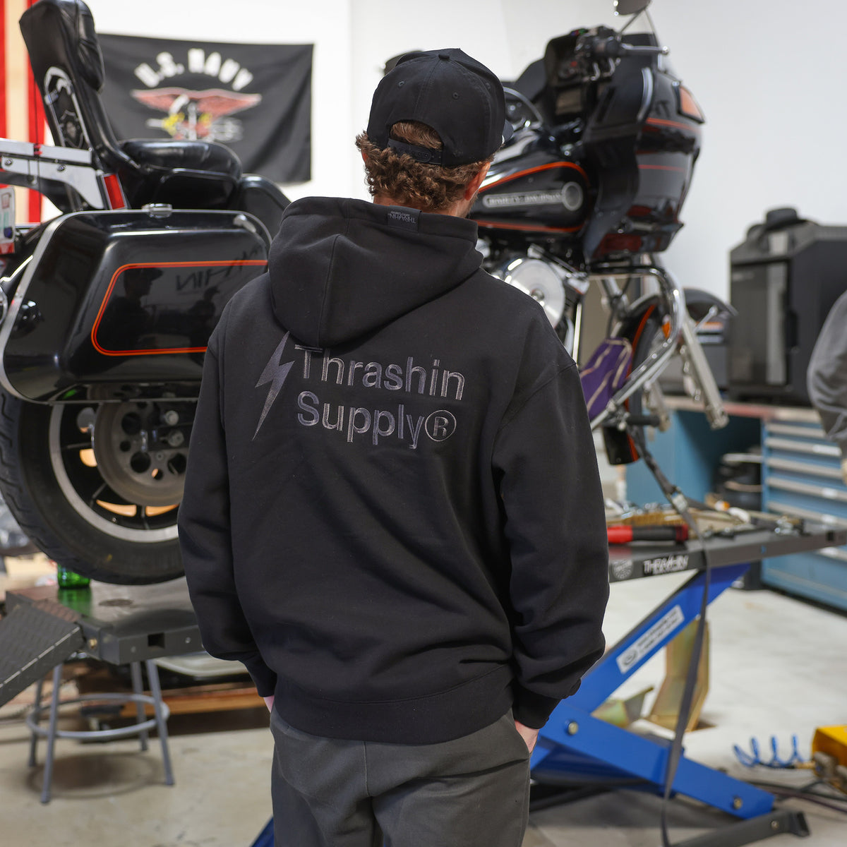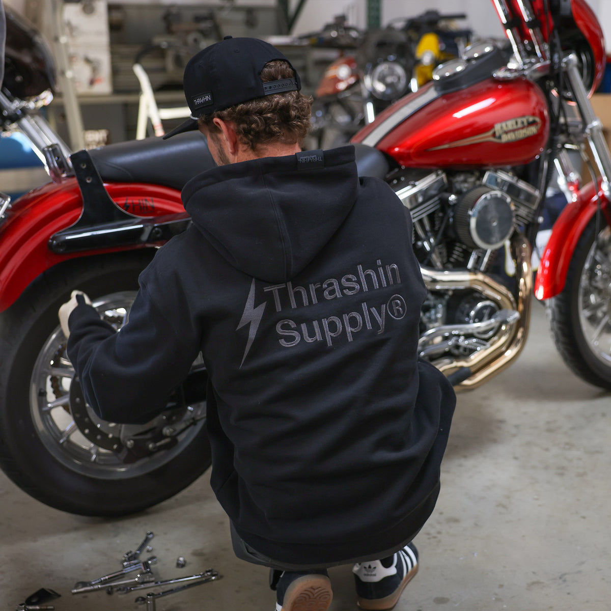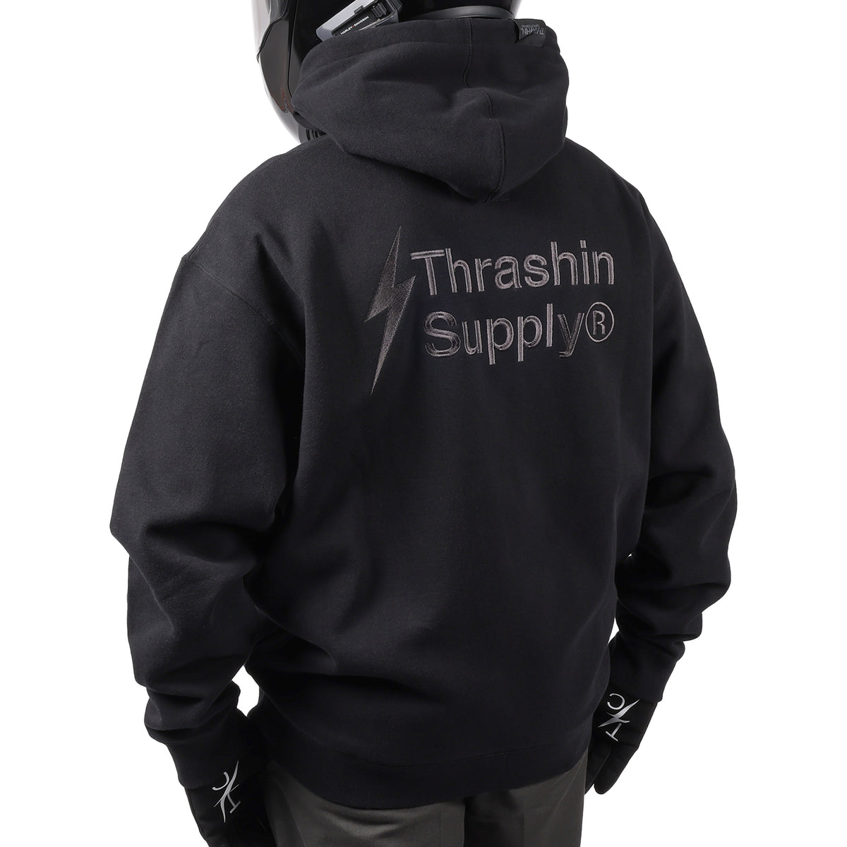Designed with riding in mind, our hoodies feature elastic thumb loops that help keep your sleeves in place while riding at high speeds and a hidden zipper pocket on the right hip with enough room to hold your phone and/or wallet! This hoodie has an oversized fit, drop shoulder, and no drawcord for a relaxed feel and modern appearance.