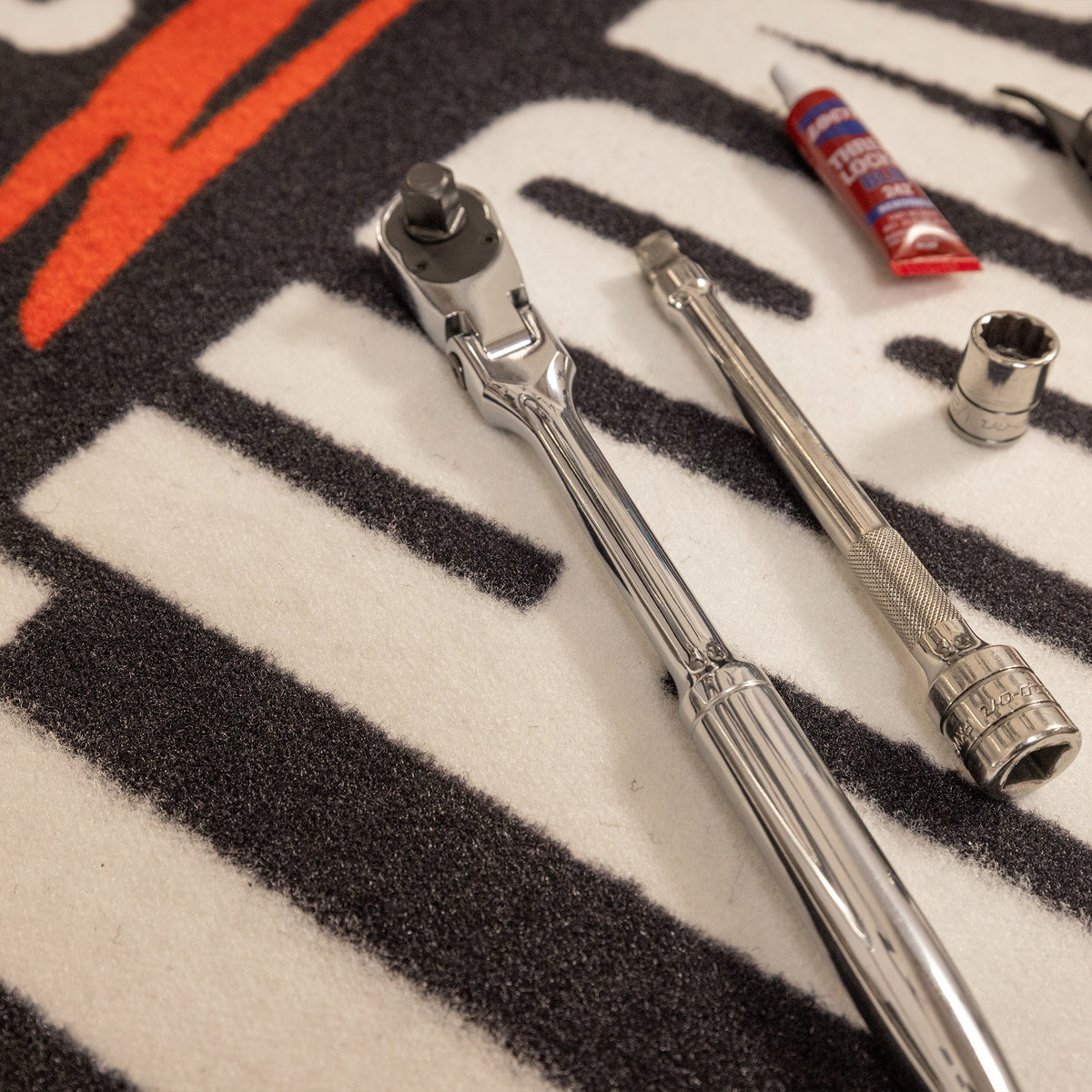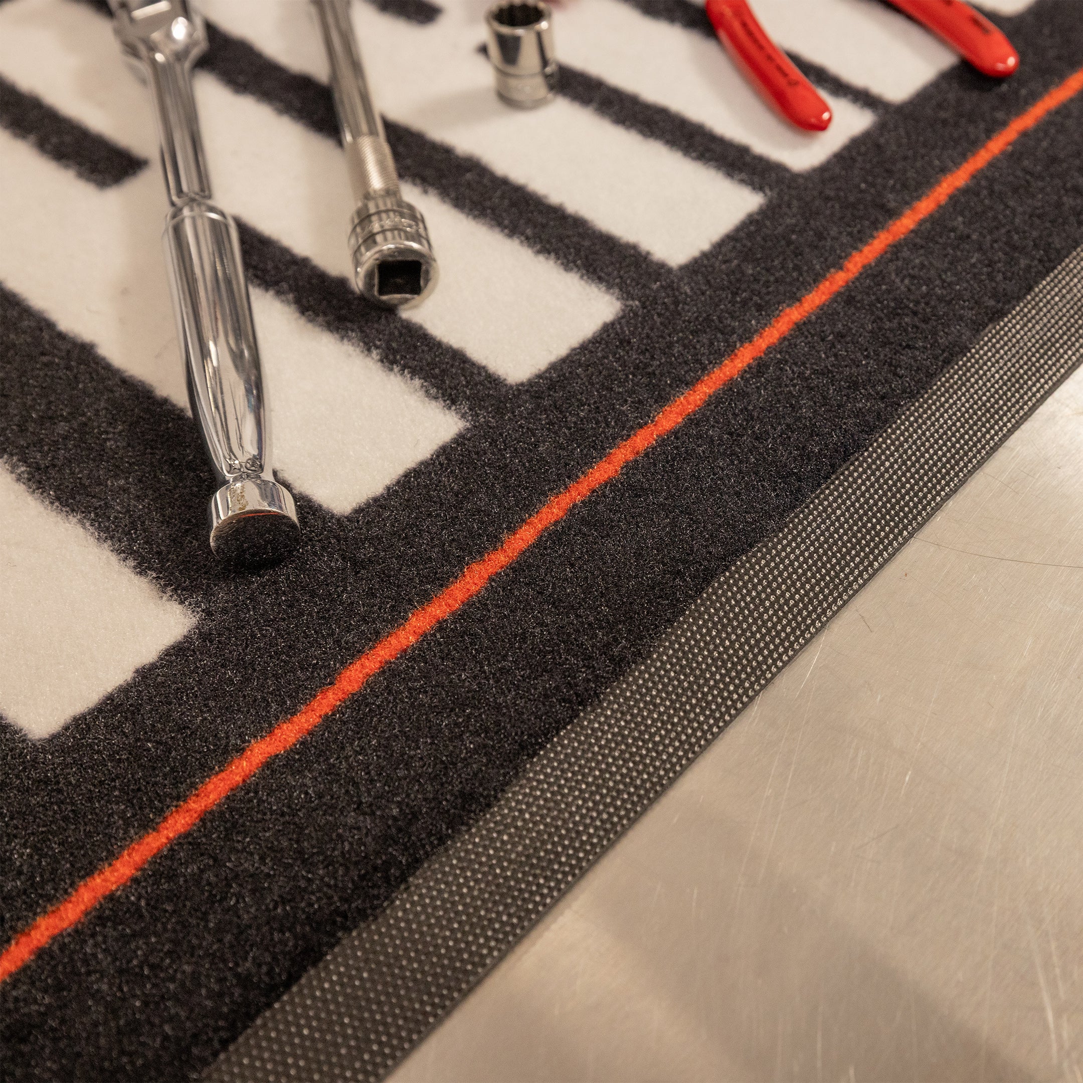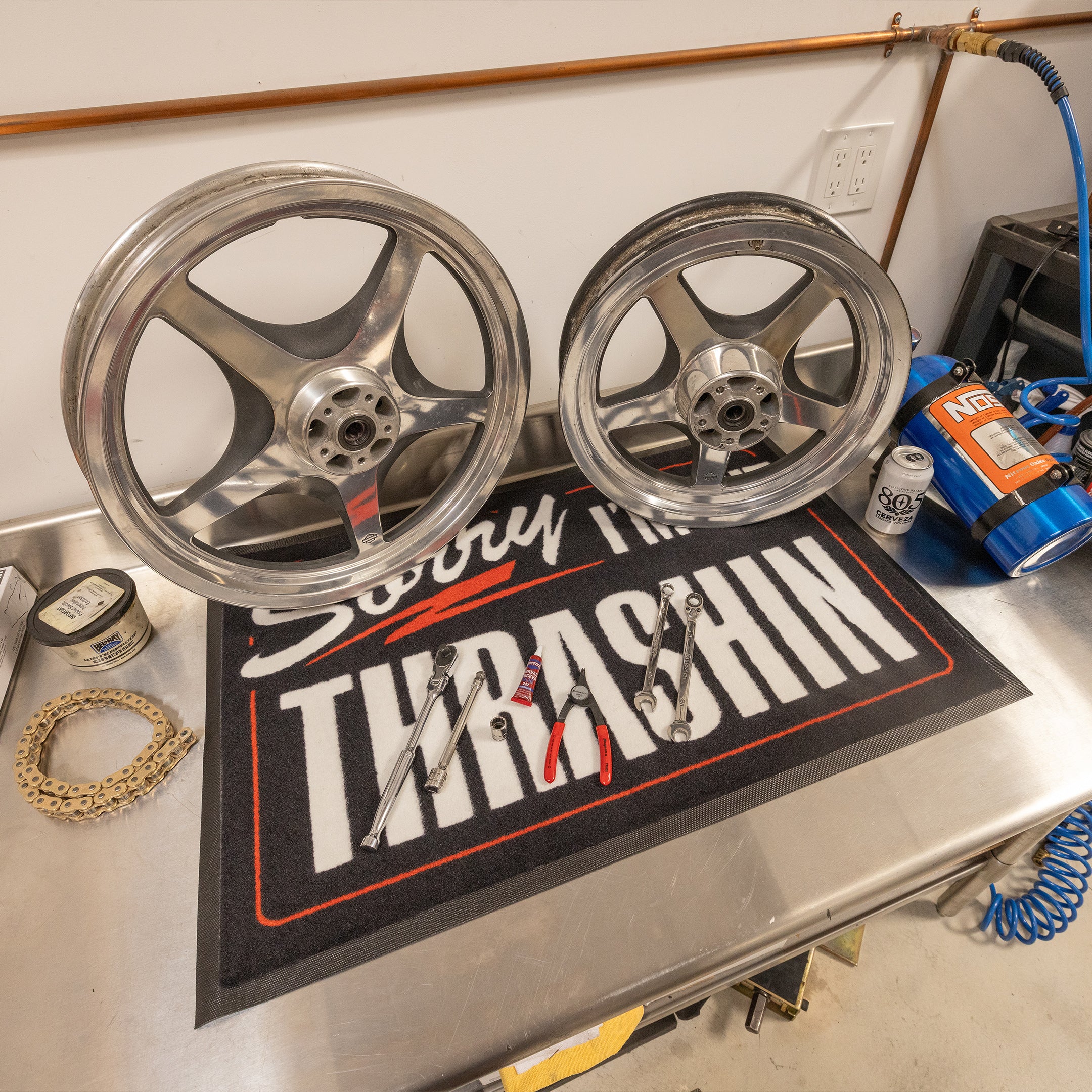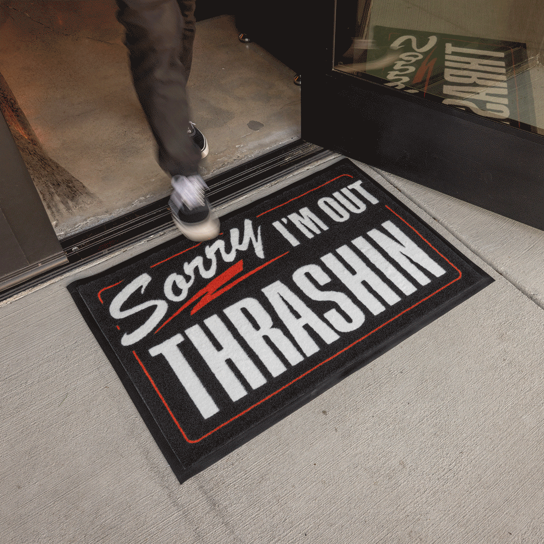 Add some style to your garage with our Out Thrashin Floor Mat! This 2' x 3' carpeted rubber mat can be used as a door mat, go under your bike, or used as a bench top mat.