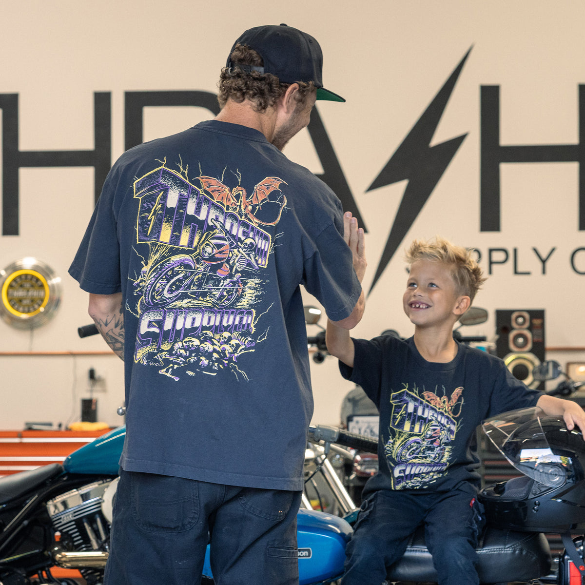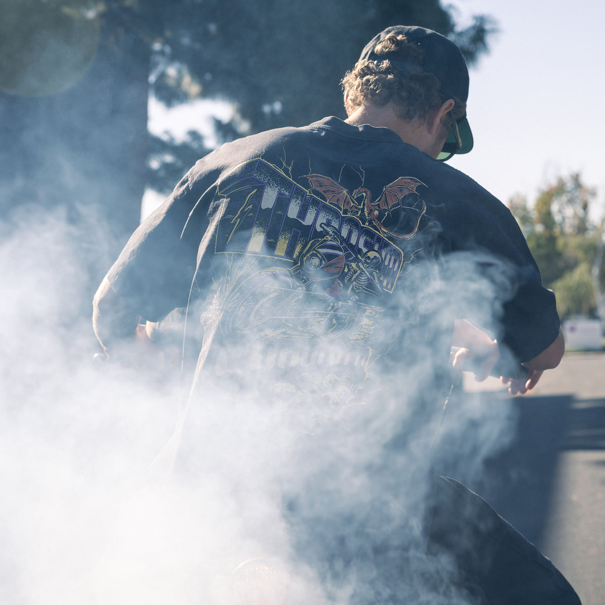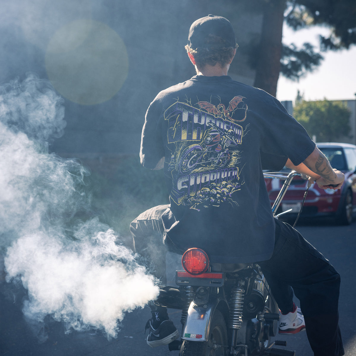 This 6.5 oz 100% cotton tee is knit, cut, sewn, and printed in United States of America. The slight drop shoulder and wide body offer a versatile fit. Matched with a lightly faded wash and soft hand 8 color screen print for that lived-in tee feel.