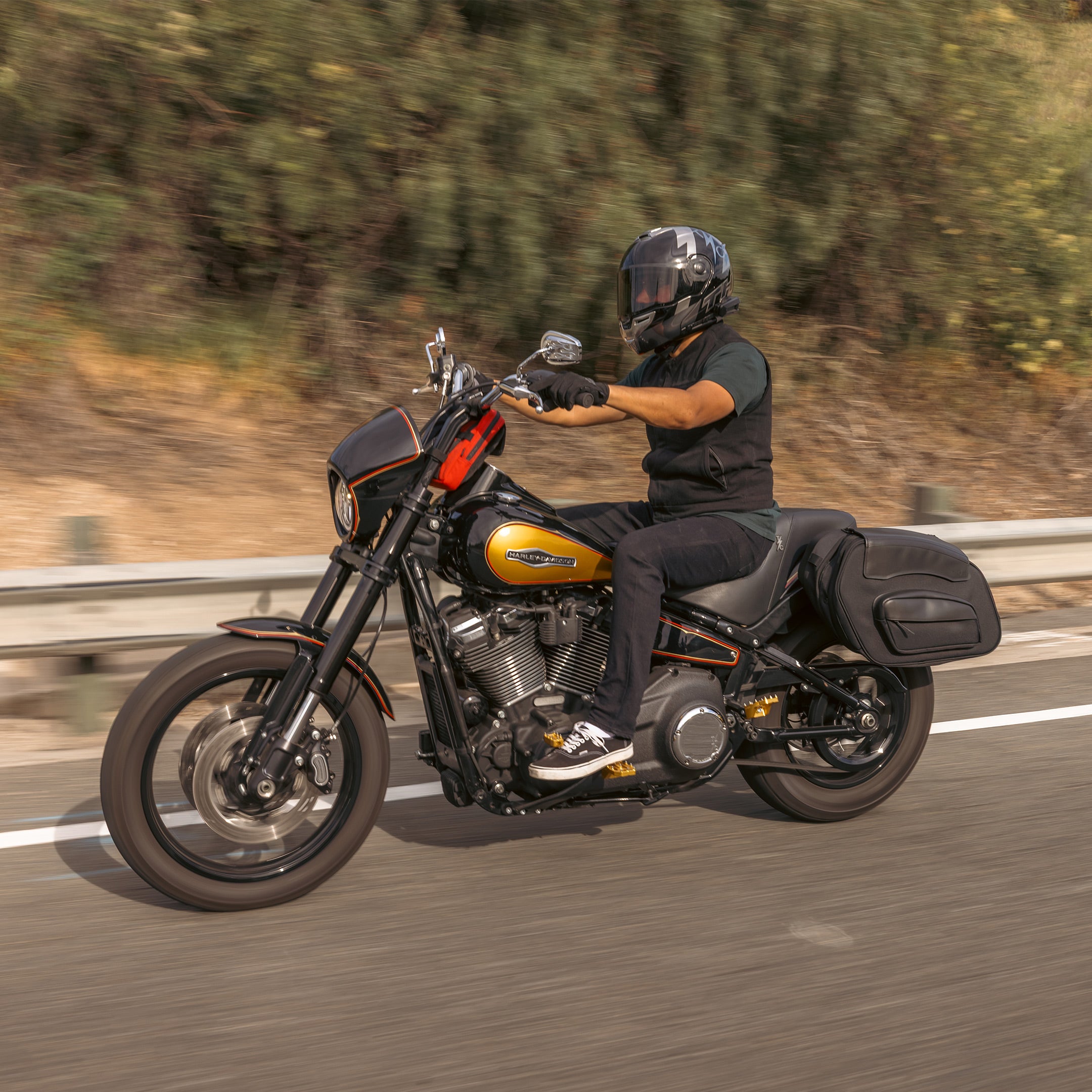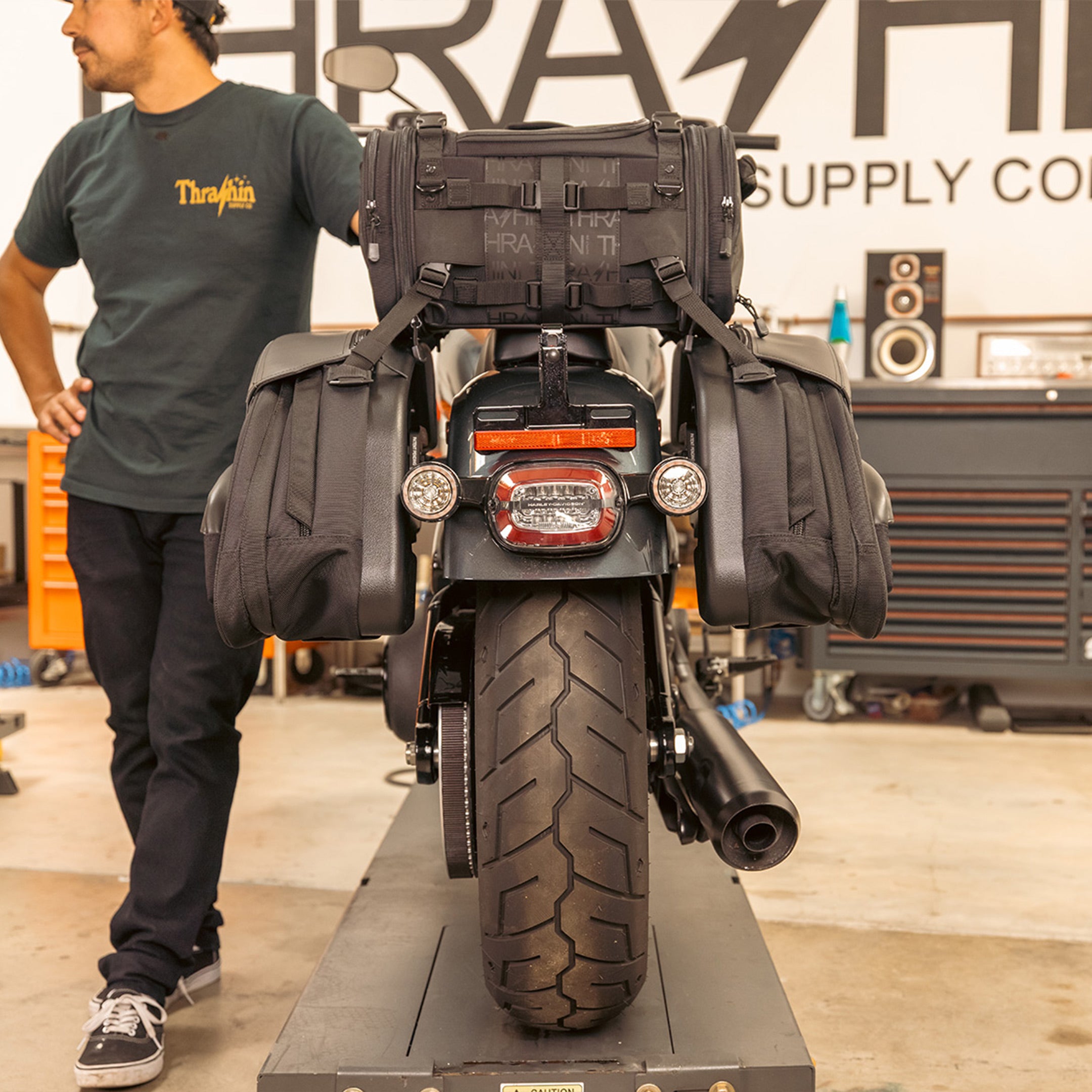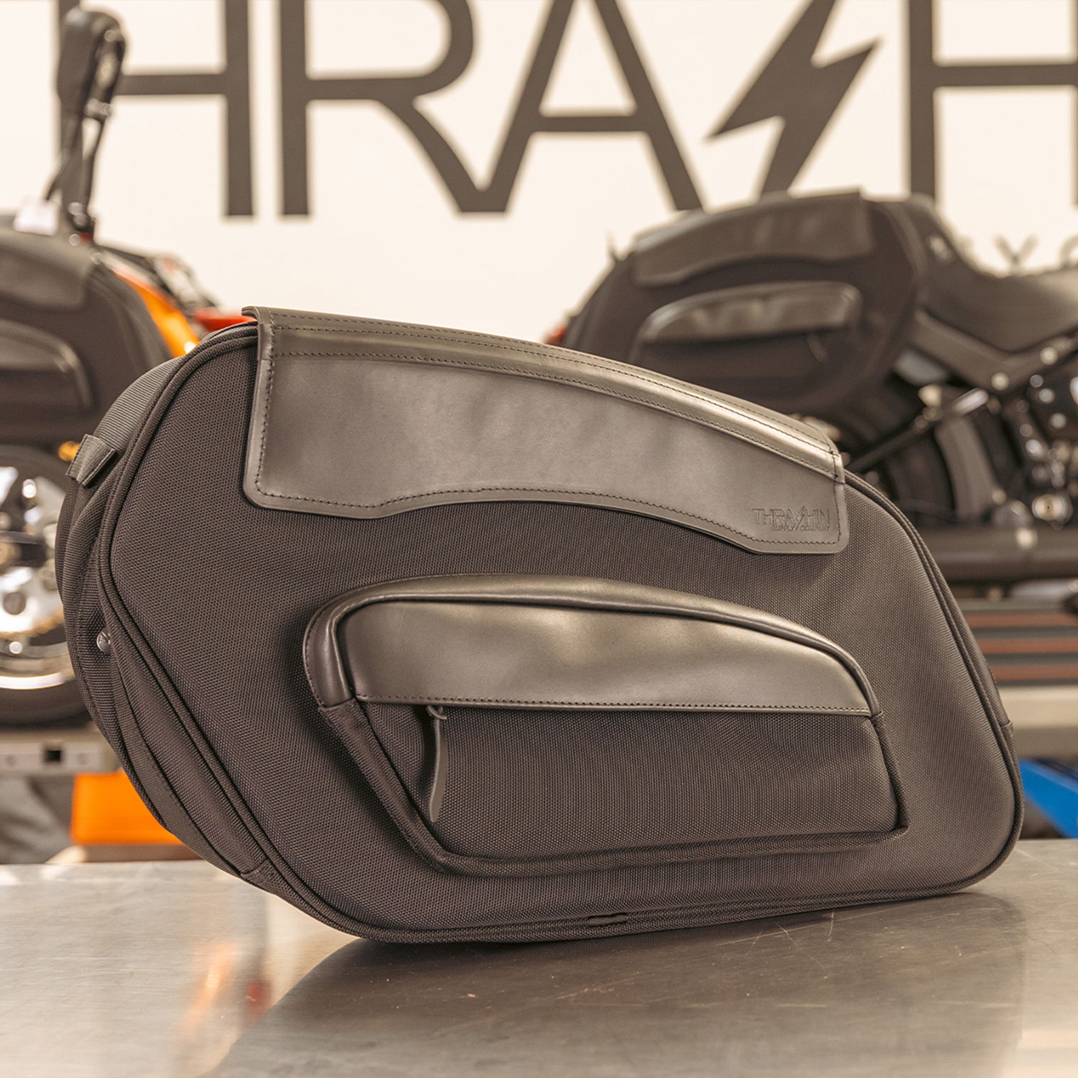 Compatible With THRASHIN® Exhaust Systems. Works with many other exhaust systems, These bags sit higher than traditional Sport Touring Saddlebags