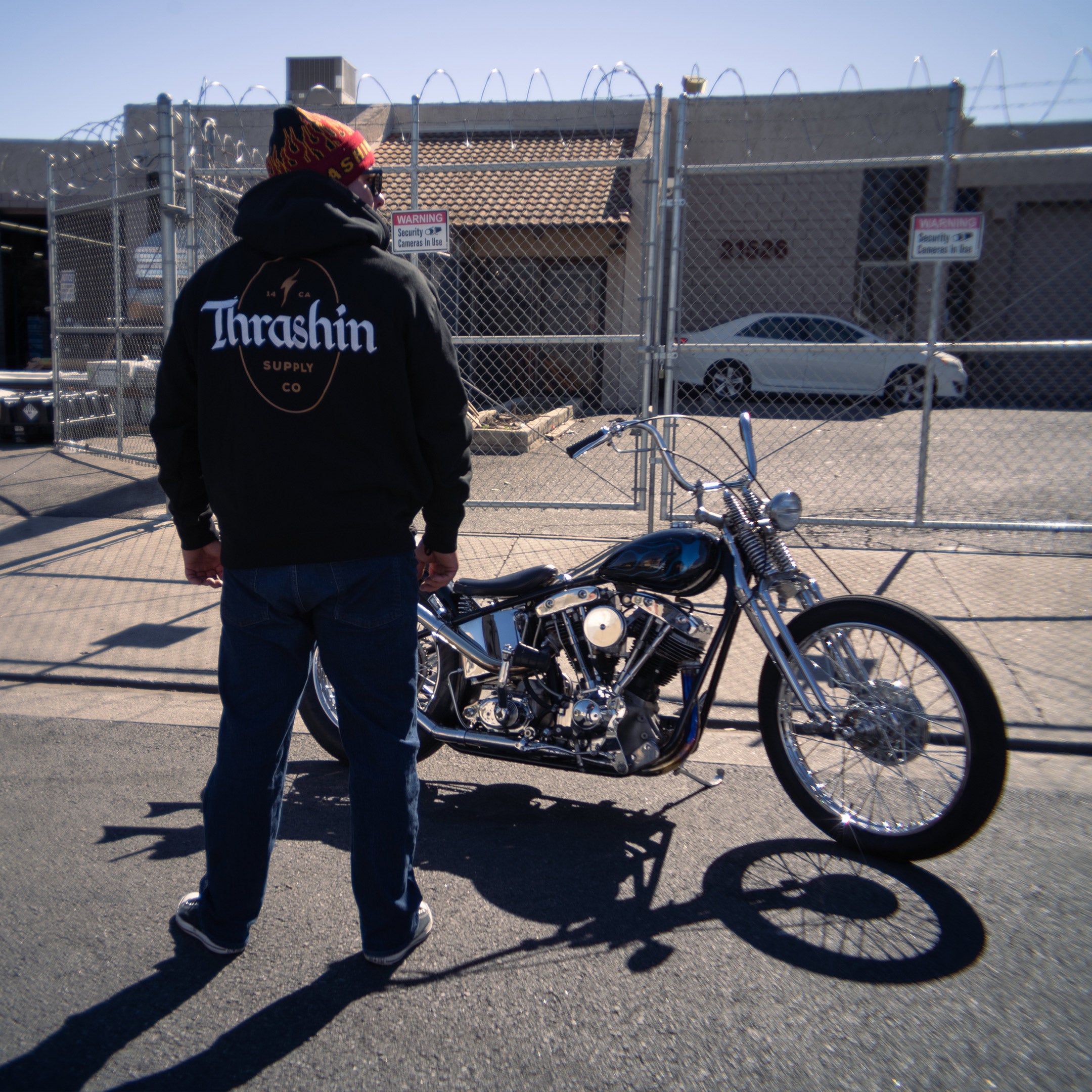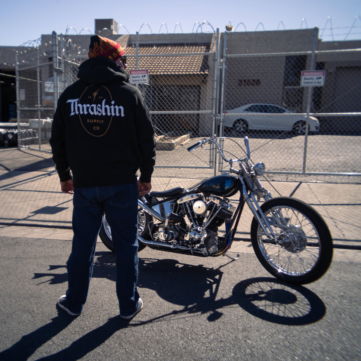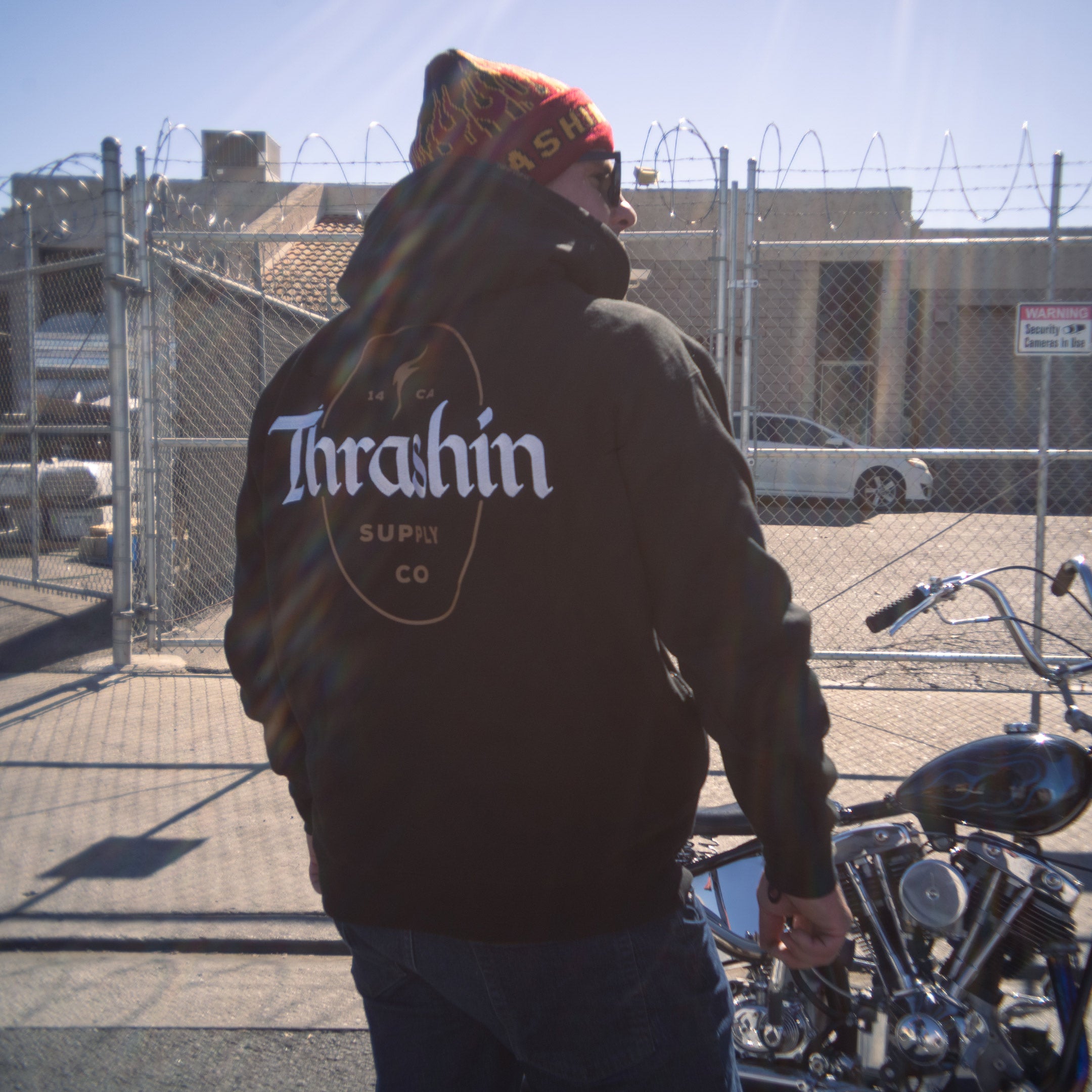 THRASHIN® Hoodies are built for the ride, featuring elastic thumb loops to keep sleeves in place at high speeds and a hidden right-hip zipper pocket big enough for your phone or wallet. Made from heavyweight 12.5oz fleece, they offer an oversized fit with a drop shoulder and no drawcord for a relaxed, modern look.