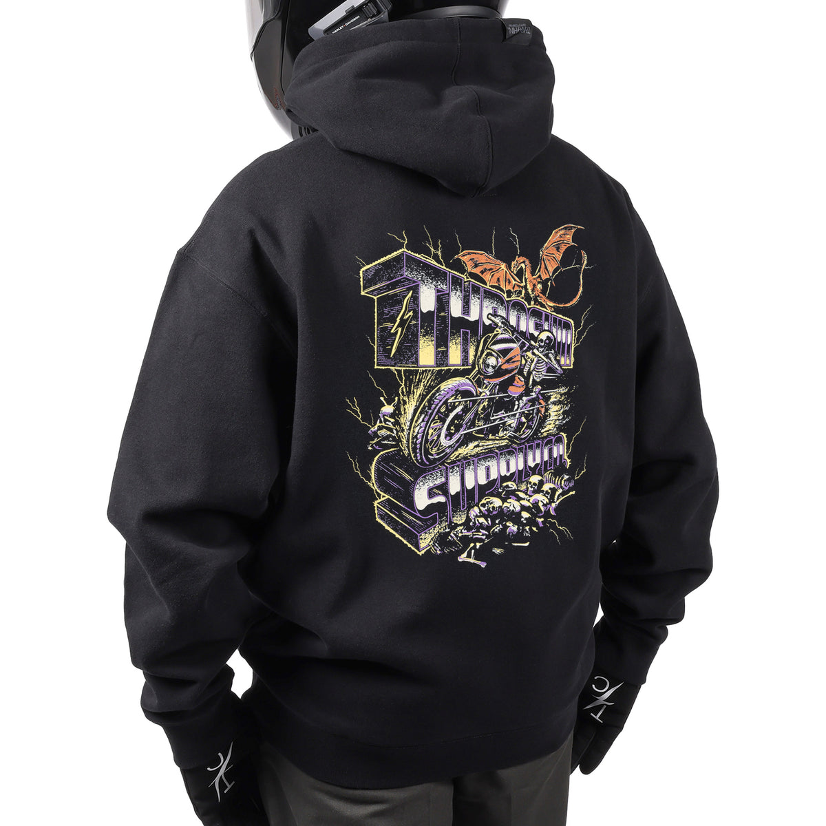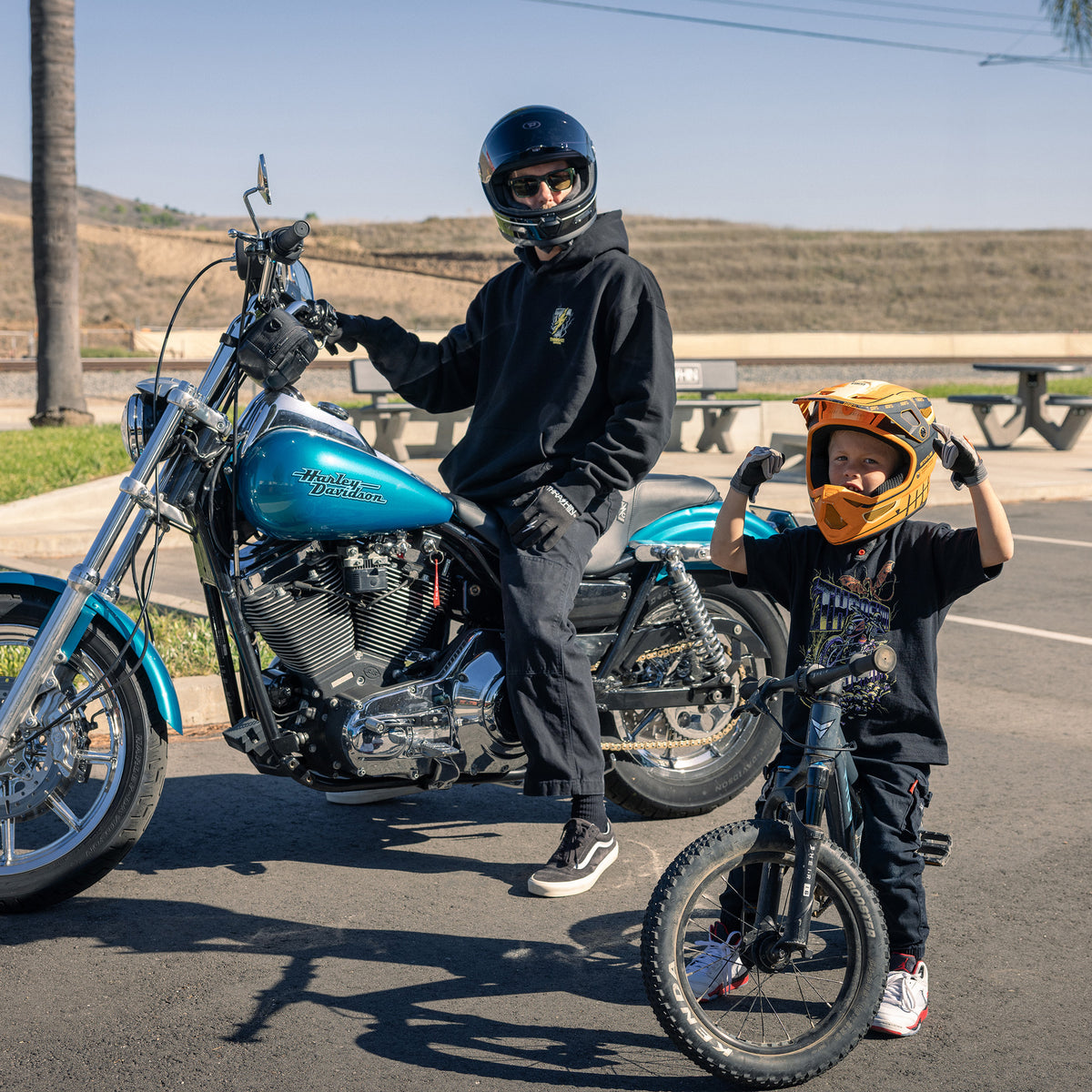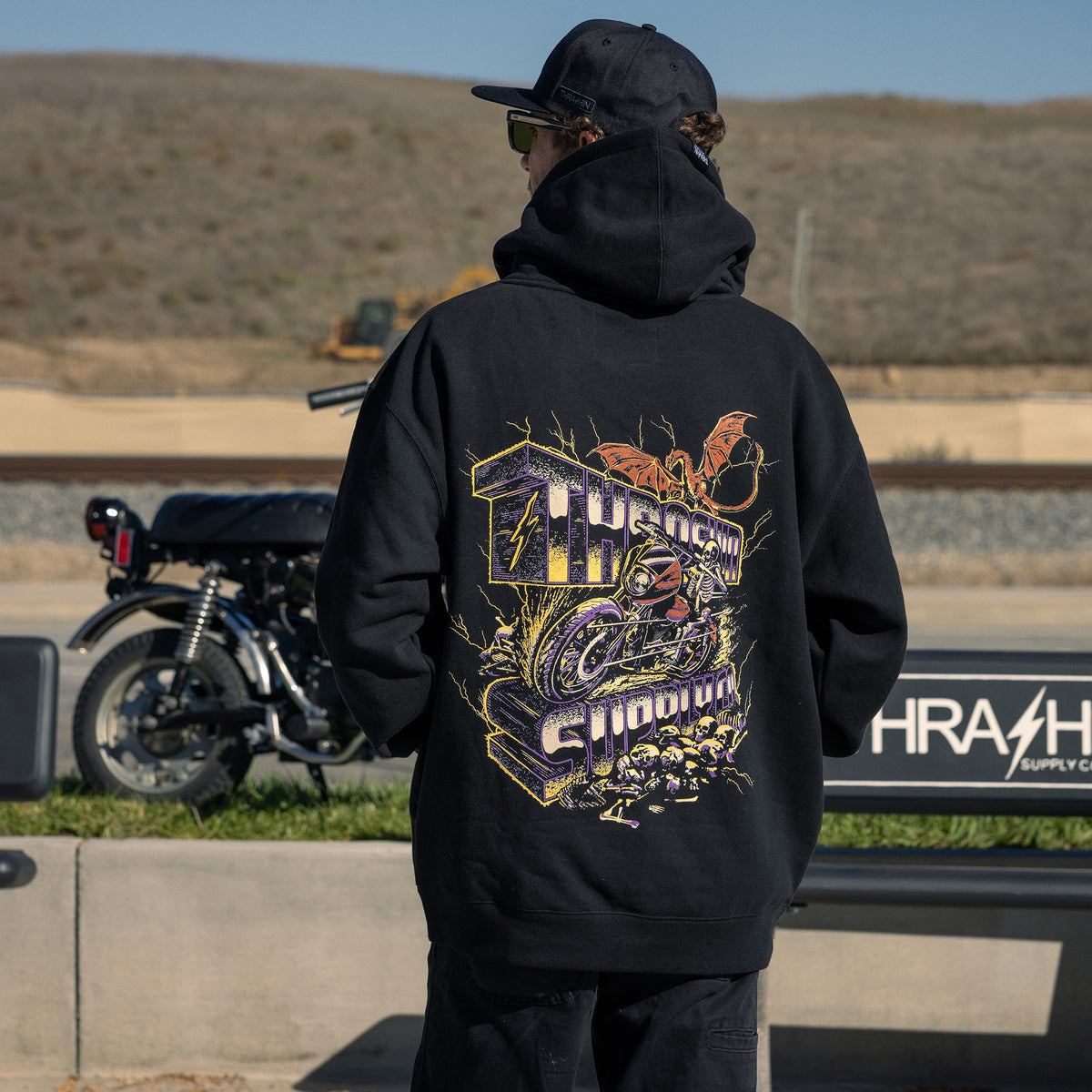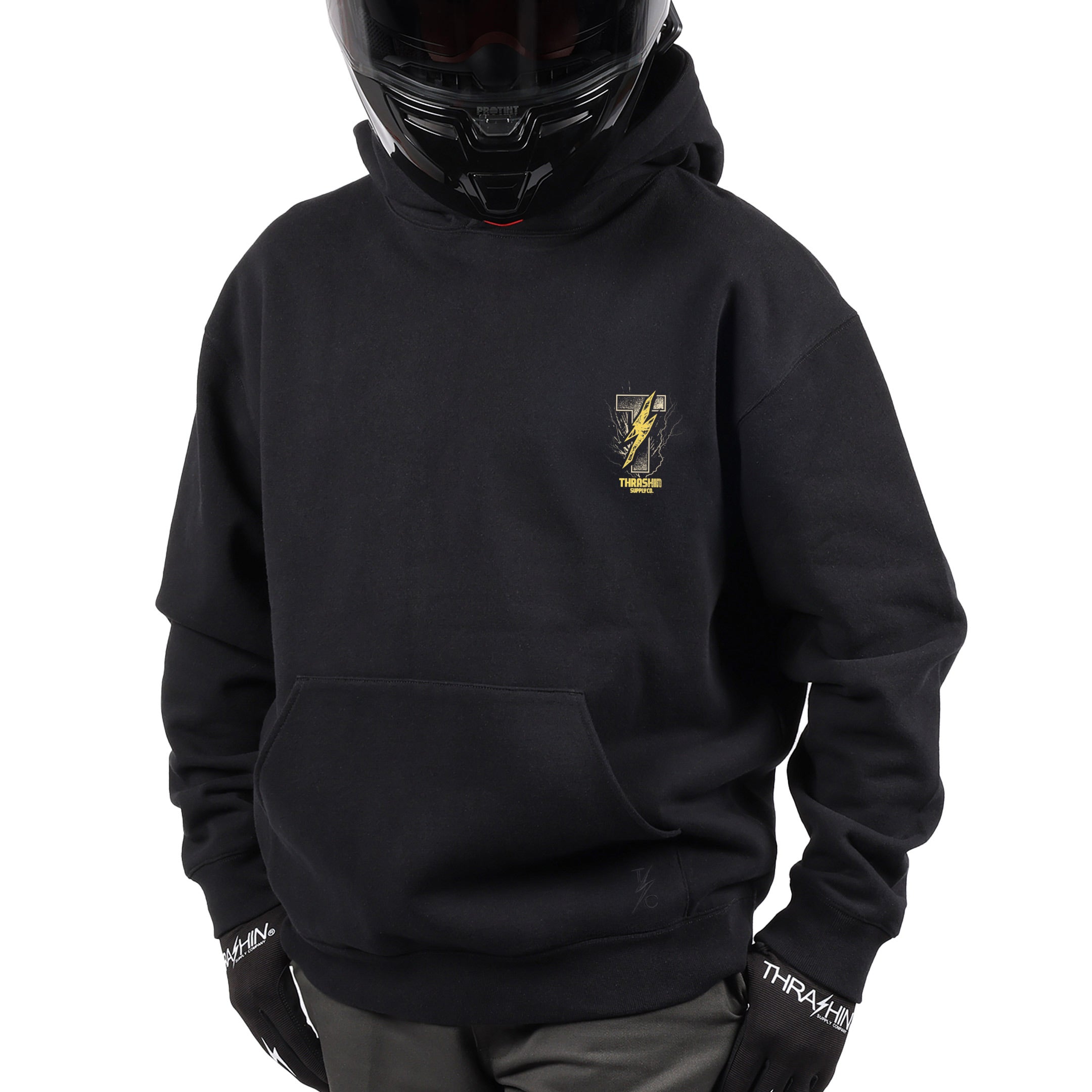 THRASHIN® Hoodies are built for the ride, featuring elastic thumb loops to keep sleeves in place at high speeds and a hidden right-hip zipper pocket big enough for your phone or wallet. Made from heavyweight 12.5oz fleece, they offer an oversized fit with a drop shoulder and no drawcord for a relaxed, modern look.