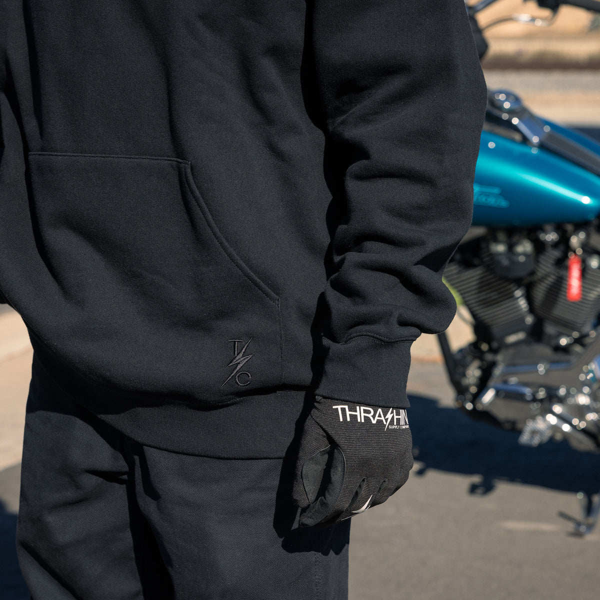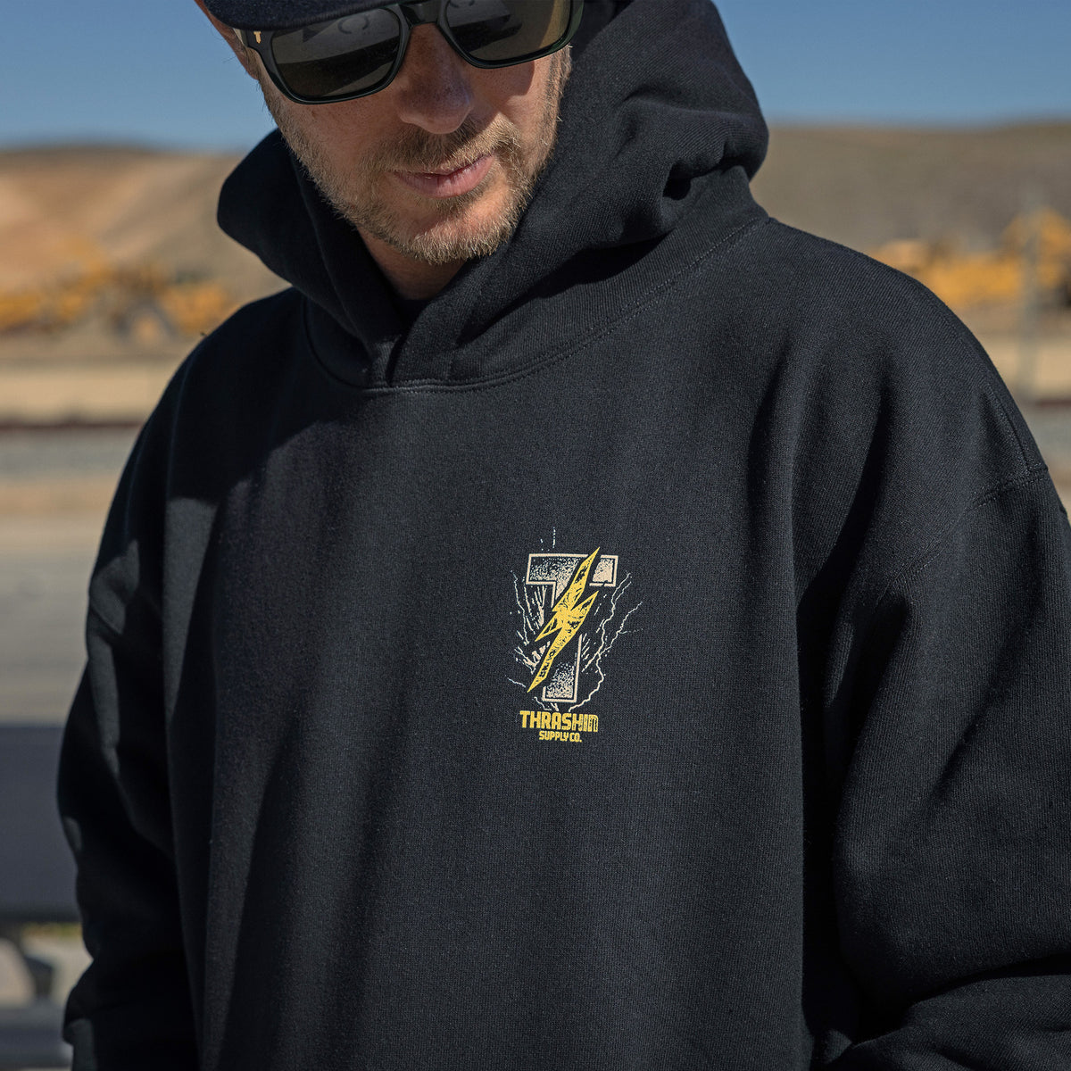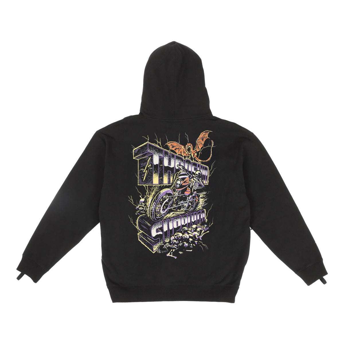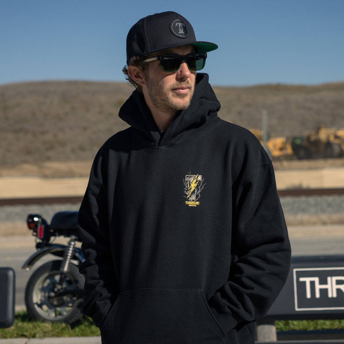 THRASHIN® Hoodies are built for the ride, featuring elastic thumb loops to keep sleeves in place at high speeds and a hidden right-hip zipper pocket big enough for your phone or wallet. Made from heavyweight 12.5oz fleece, they offer an oversized fit with a drop shoulder and no drawcord for a relaxed, modern look.