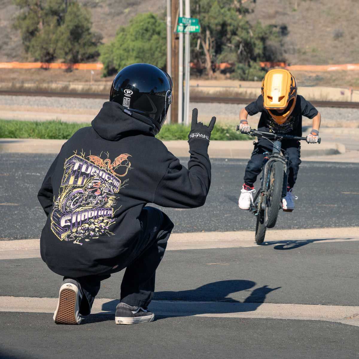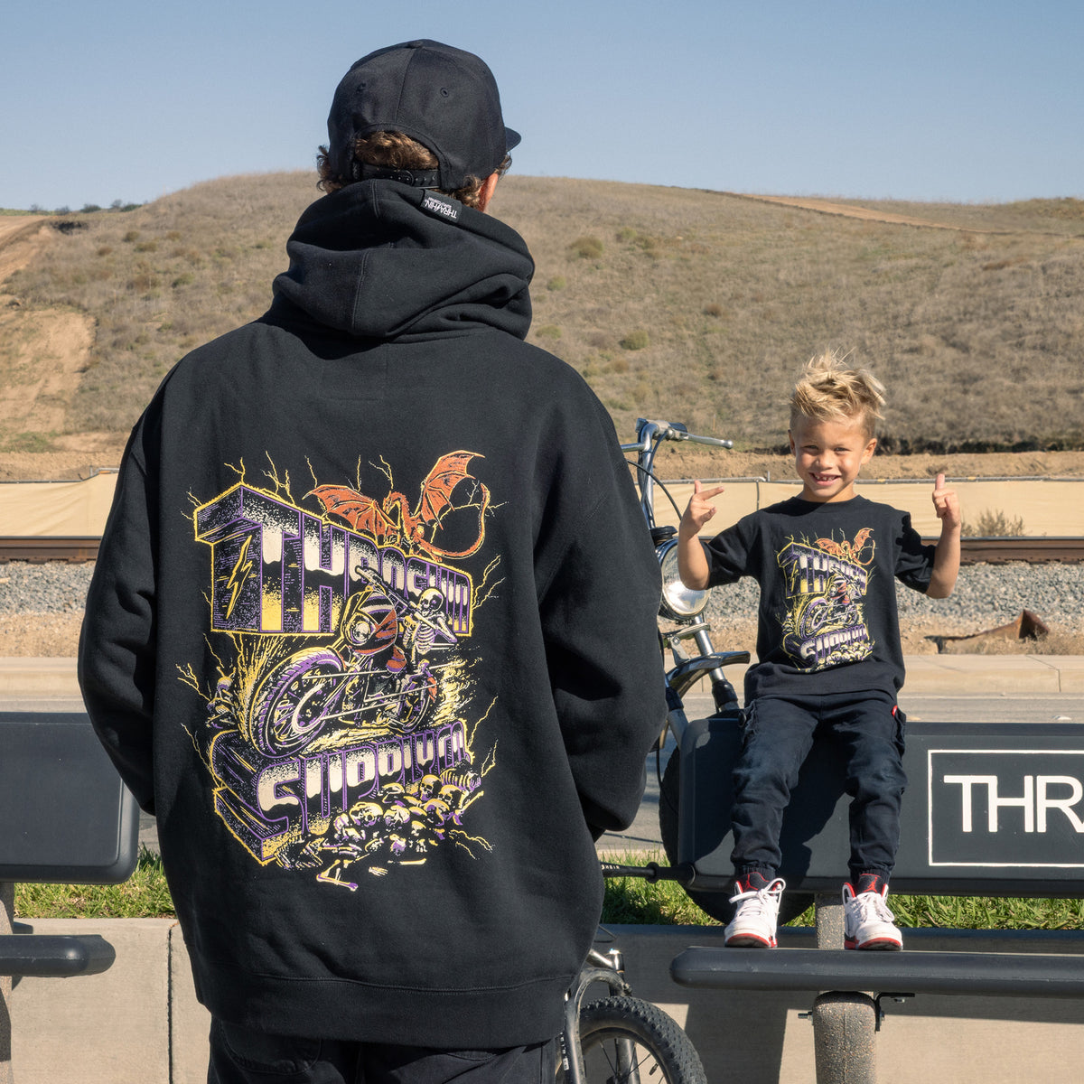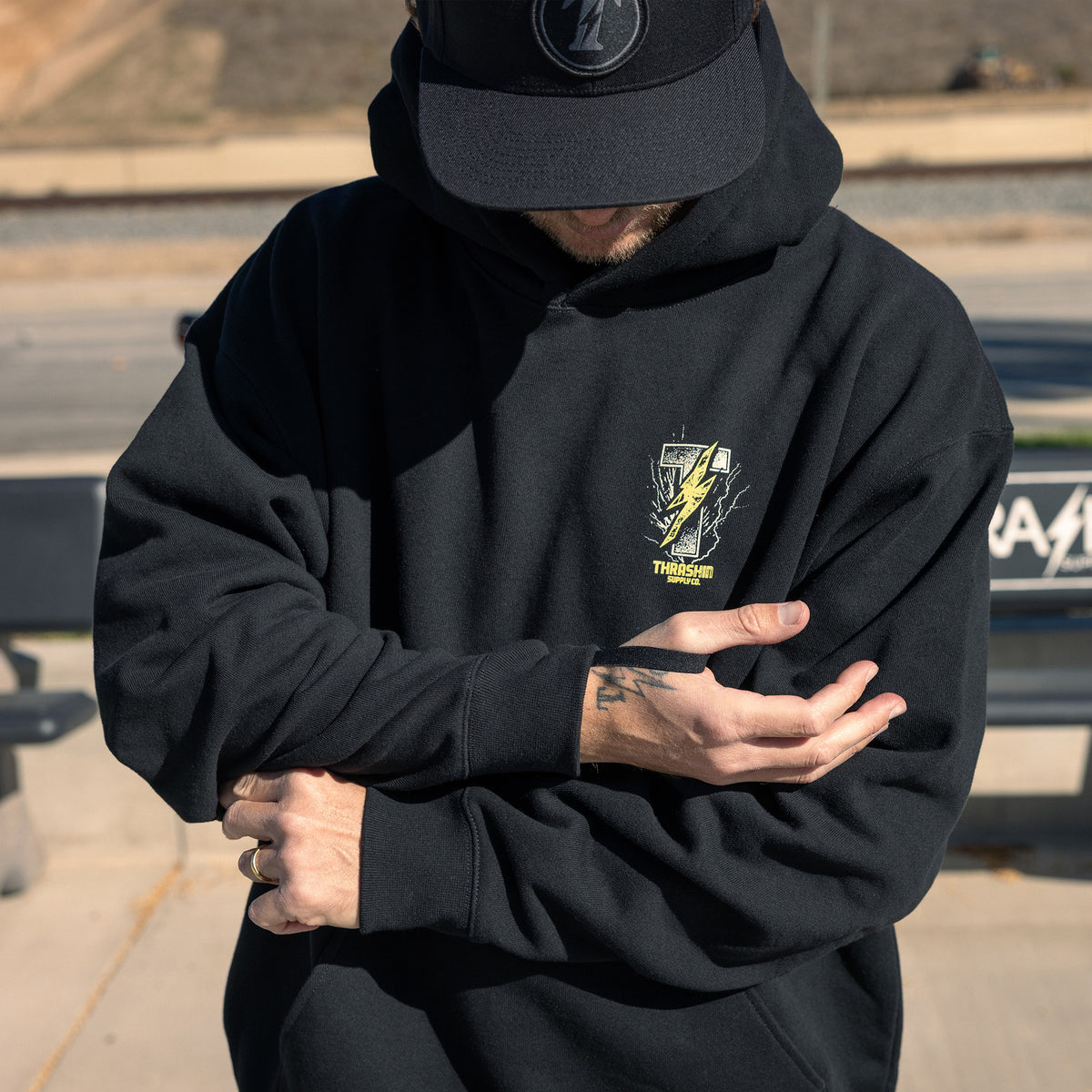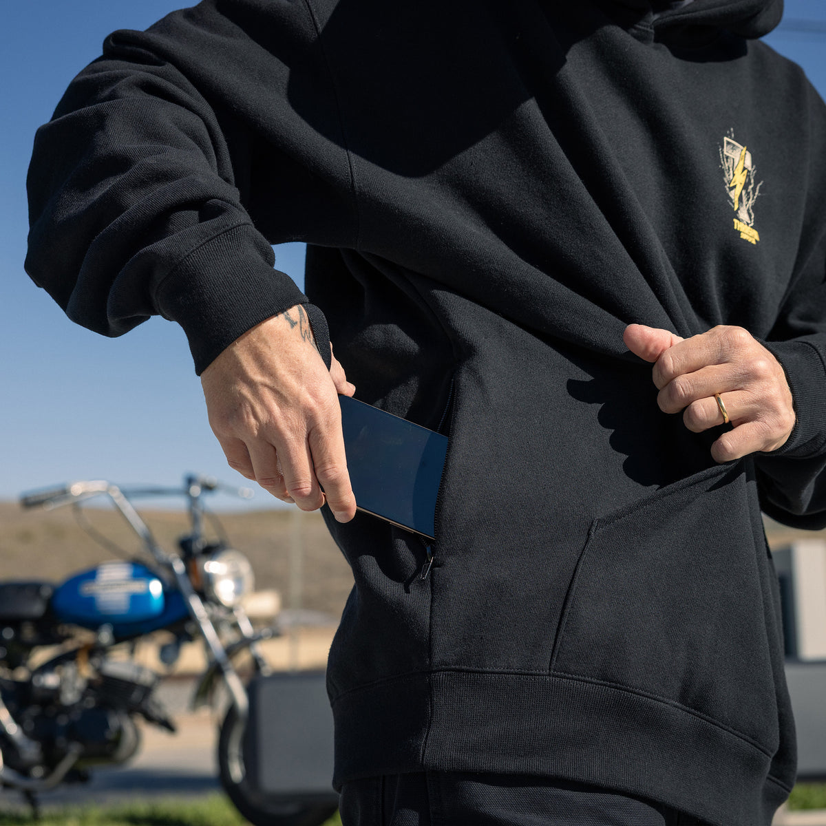 THRASHIN® Hoodies are built for the ride, featuring elastic thumb loops to keep sleeves in place at high speeds and a hidden right-hip zipper pocket big enough for your phone or wallet. Made from heavyweight 12.5oz fleece, they offer an oversized fit with a drop shoulder and no drawcord for a relaxed, modern look.