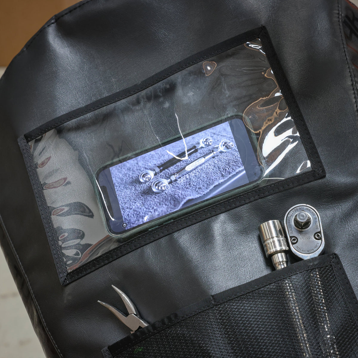 - Clear pocket for work orders, notes, or cellphone